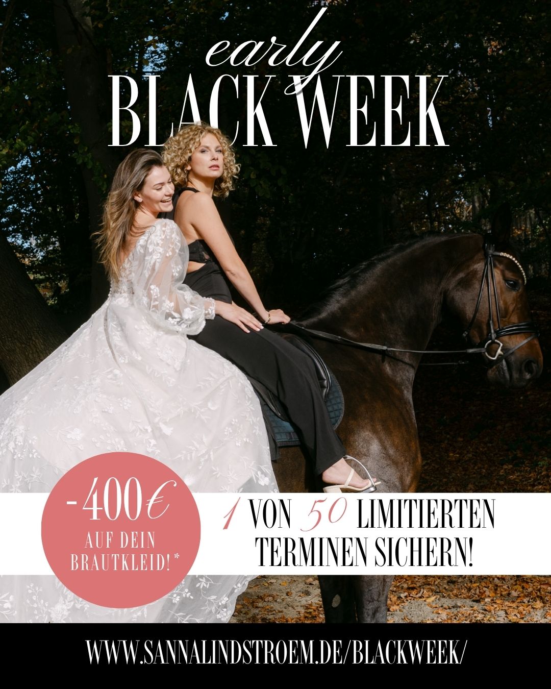 Unsere Early Black Week ist da - und mit ihr ein ganz besonderes Dankeschön an unsere Bräute. Die ersten 50, die sich ihren Anprobetermin bis zum 31.01.26 sichern, erhalten -400 € auf ihr Brautkleid* - definitiv unsere größte Aktion des Jahres! Hier alle Infos entdecken ... <3