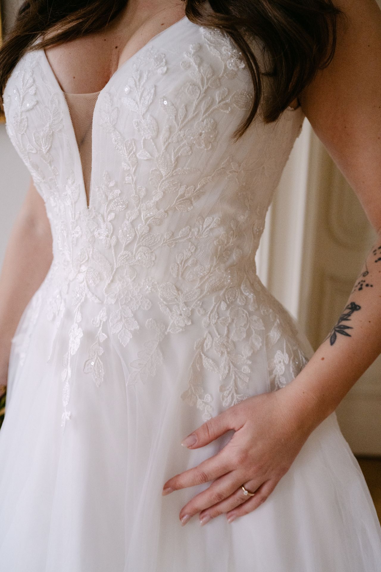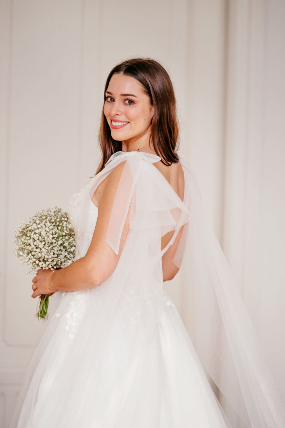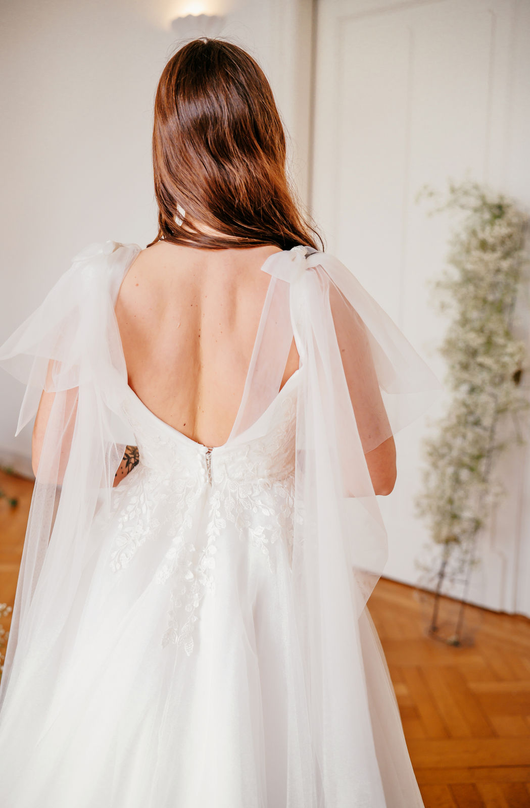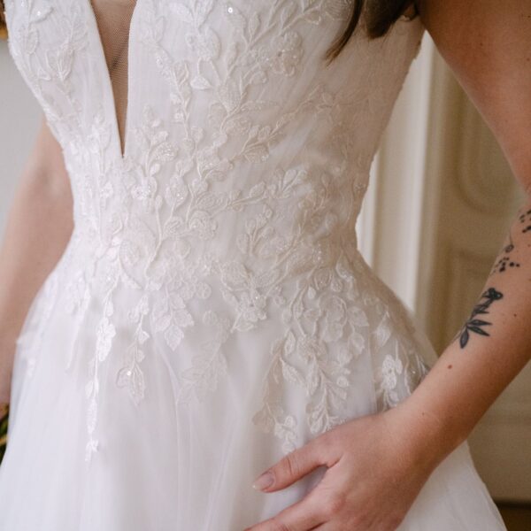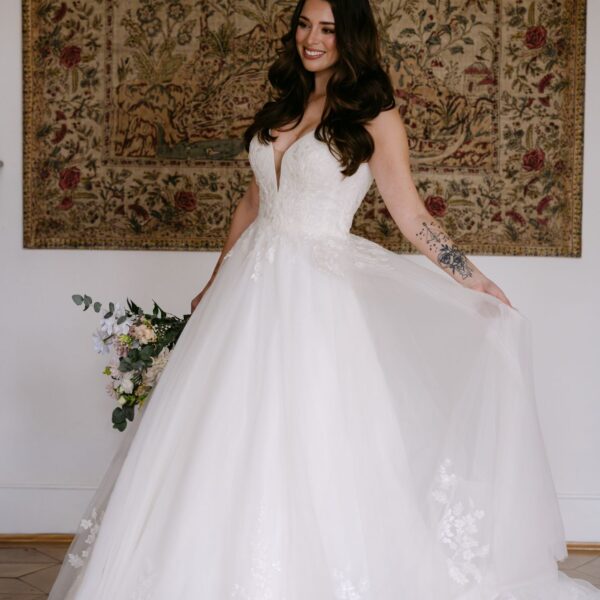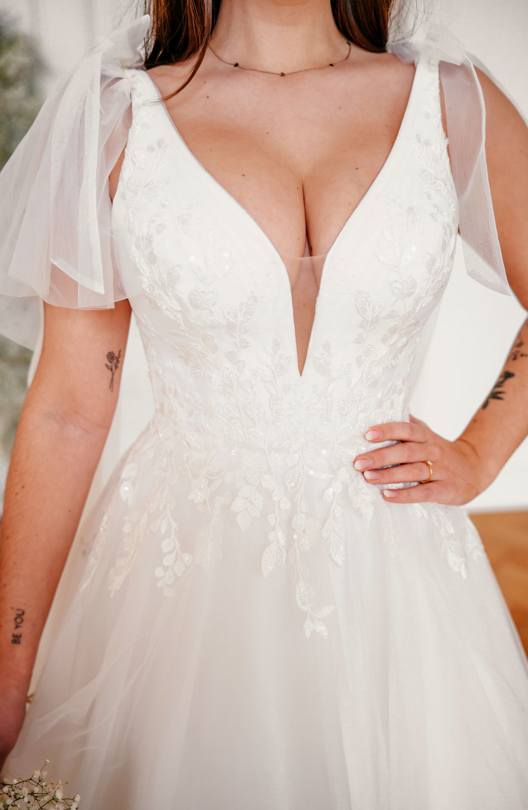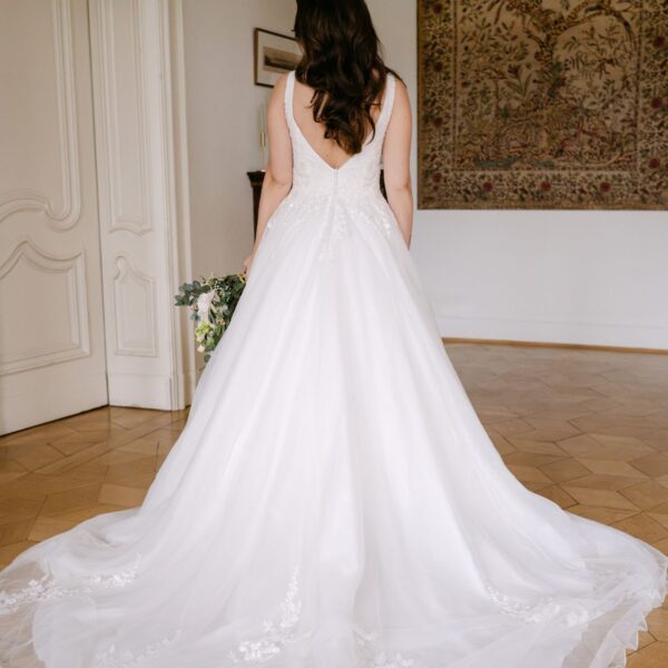 Abby ist komplett ivory unterlegt, der tiefe V-Ausschnitt ist jedoch ein transparentes Highlight. Die funkelnde Blumenspitze fließt in den Rock und wiederholt sich über den ganzen ivory farbenen Tüllrock verteilt. Eine besonderer Hingucker sind die abnehmbaren Tüllschleifen, die wie ein Cape über die Schultern bis hinab auf die Schleppe fließen.