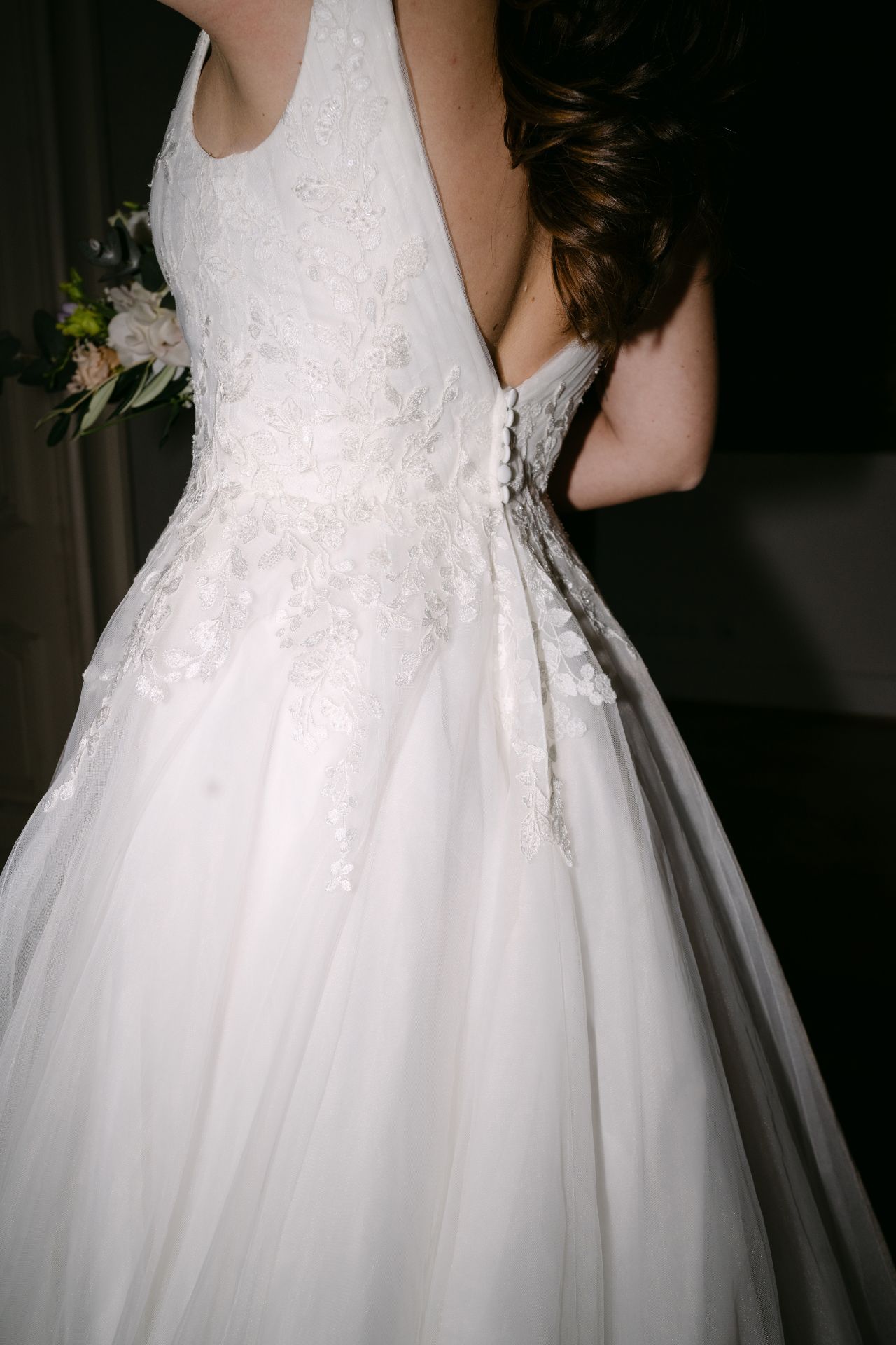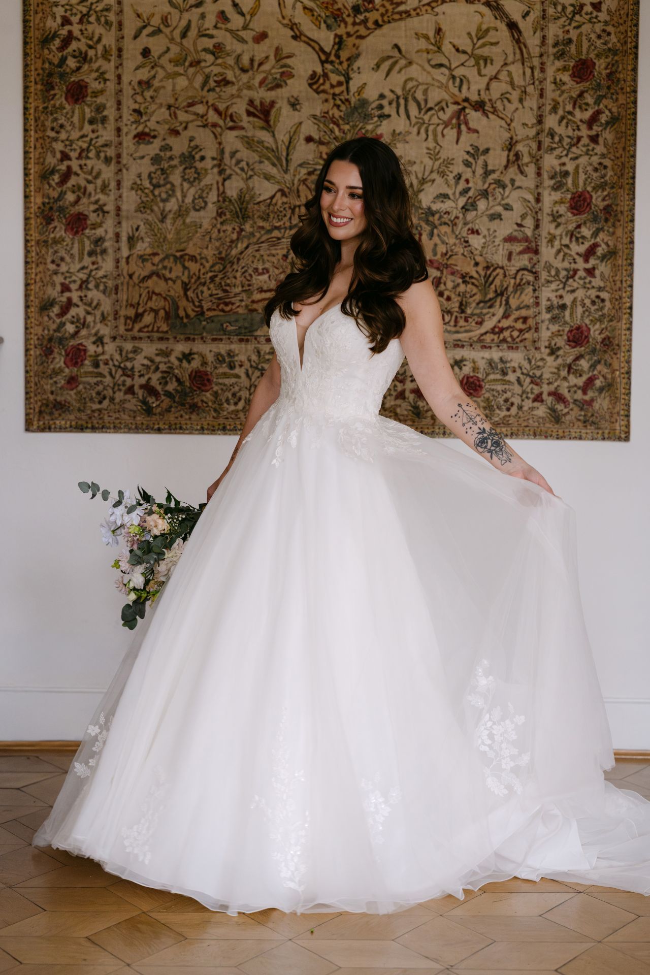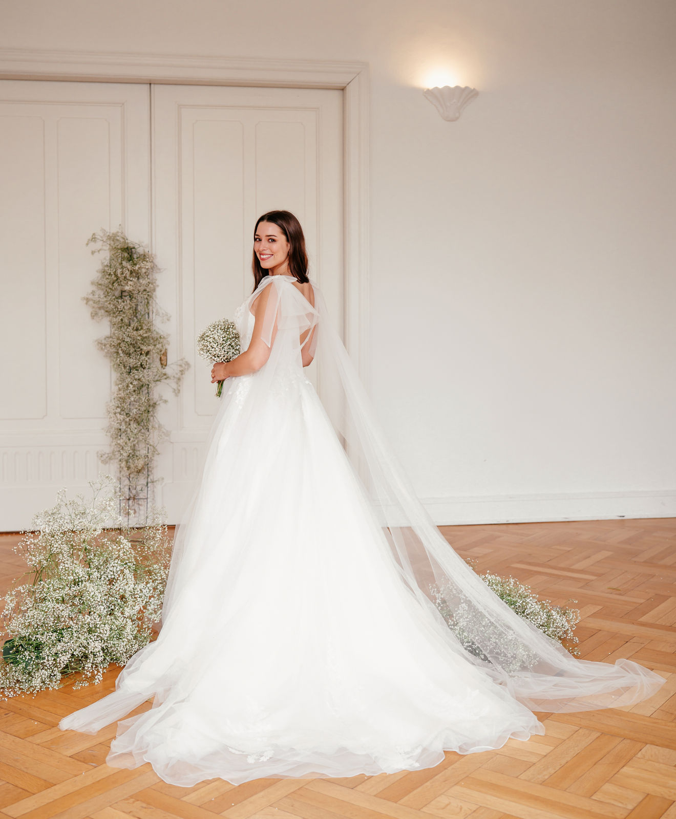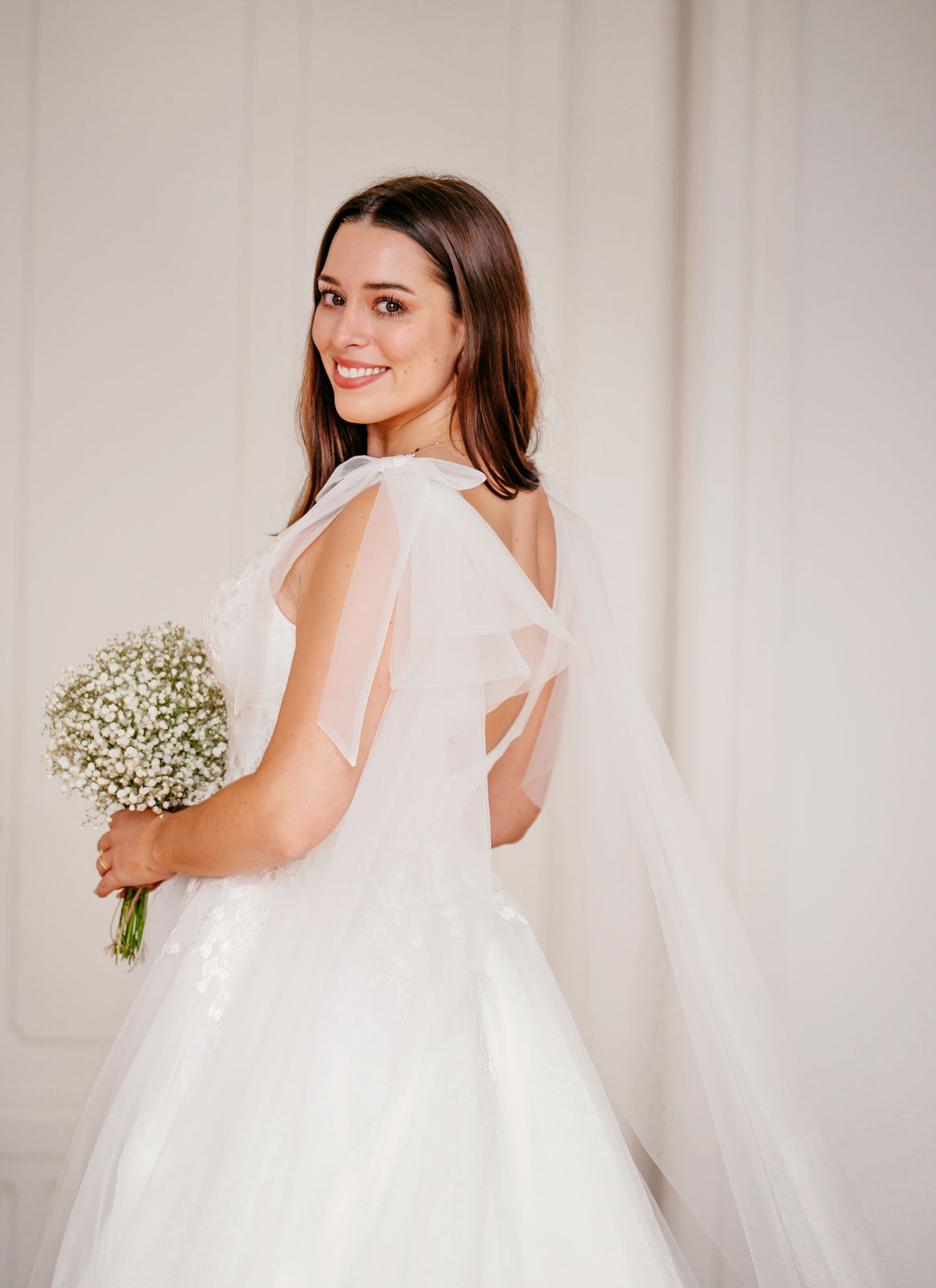 Abby ist komplett ivory unterlegt, der tiefe V-Ausschnitt ist jedoch ein transparentes Highlight. Die funkelnde Blumenspitze fließt in den Rock und wiederholt sich über den ganzen ivory farbenen Tüllrock verteilt. Eine besonderer Hingucker sind die abnehmbaren Tüllschleifen, die wie ein Cape über die Schultern bis hinab auf die Schleppe fließen.