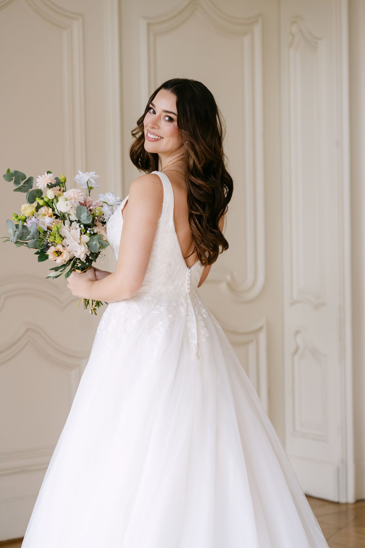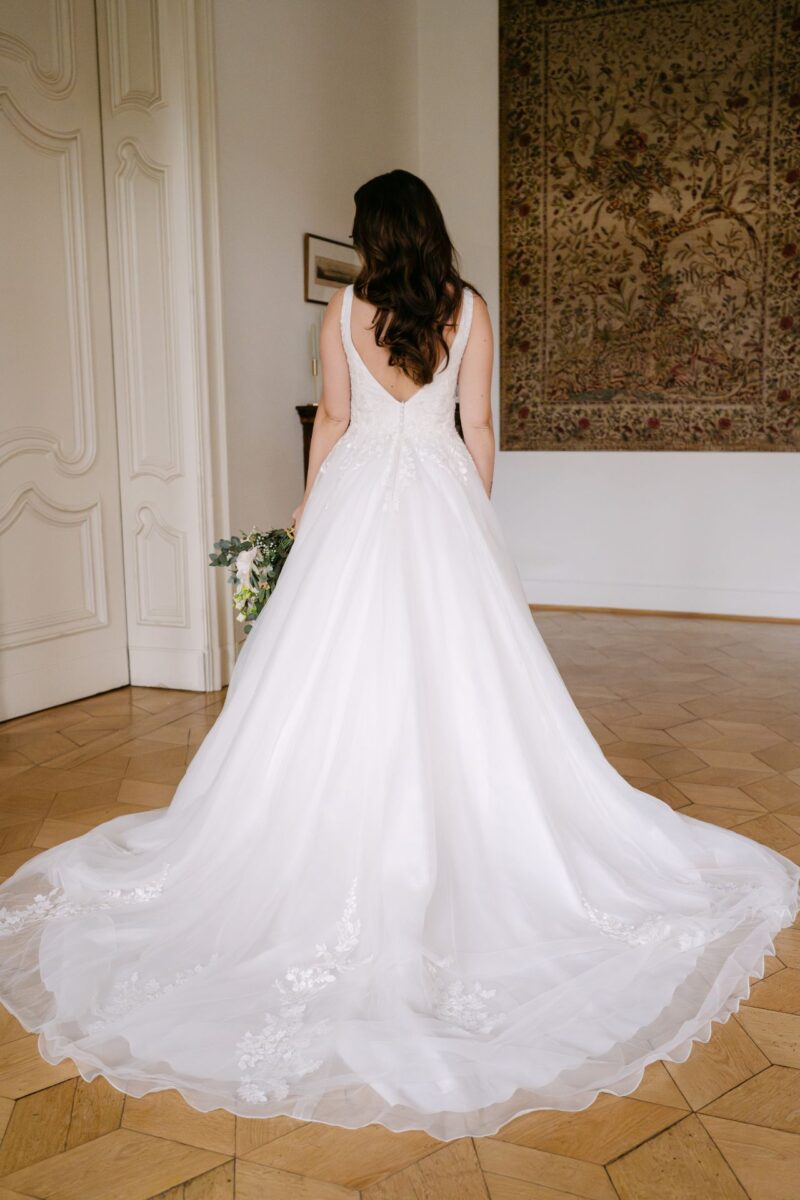 Dieses Kleid lässt sich teilweise mitgestalten. Beliebte Individualisierungen unserer Bräute sind z. B. Ärmelvariationen oder Farbwechsel. Je nach Verfügbarkeit auch vergünstigt zur Direktmitnahme möglich.