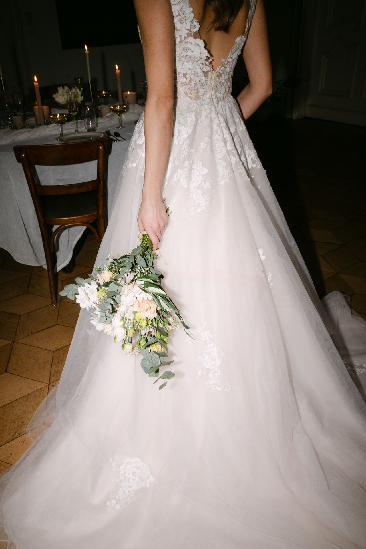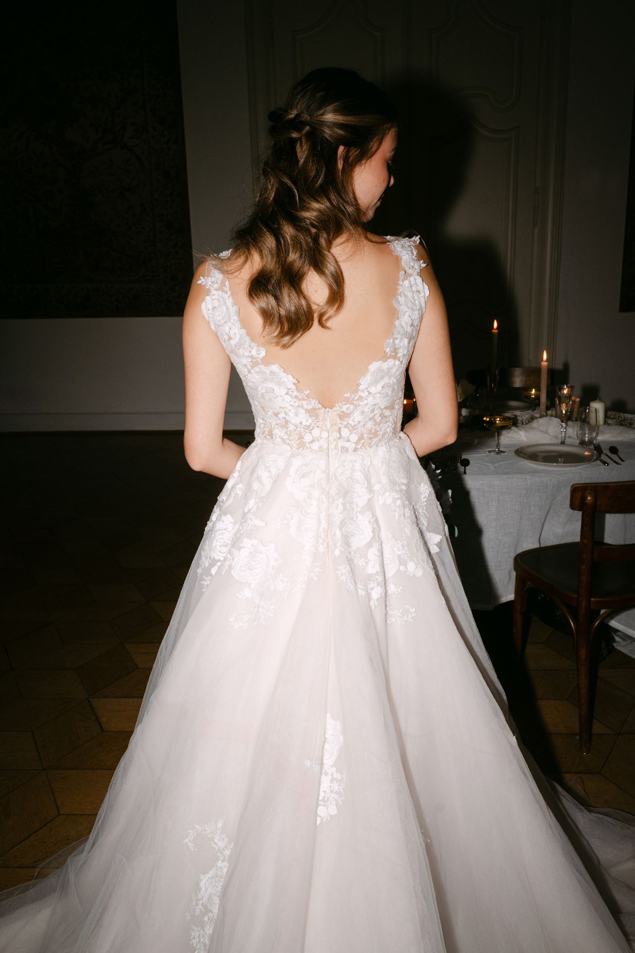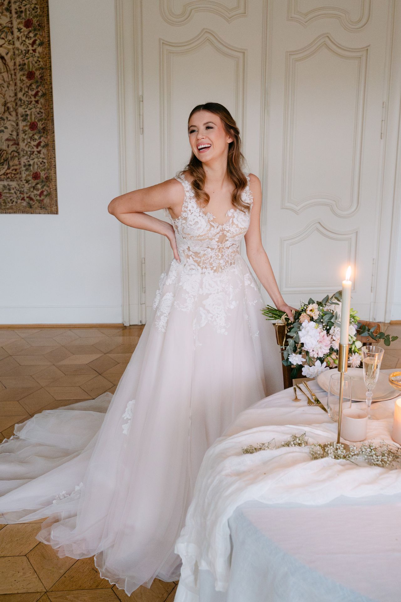 Ein sehr romantisch-verträumtes Modell mit weicher, großflächiger und floraler Spitze. Von der transparenten, nude unterlegten Corsage verläuft diese spielend in den Rock, wo vereinzelte Spitzenapplikationen vernäht sind. Vielleicht DER Mädchentraum unserer Kollektion.