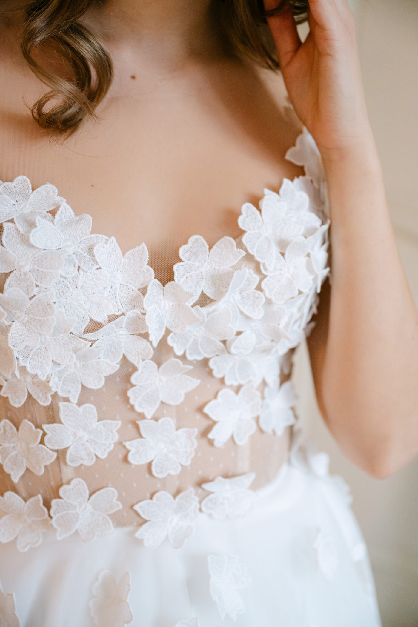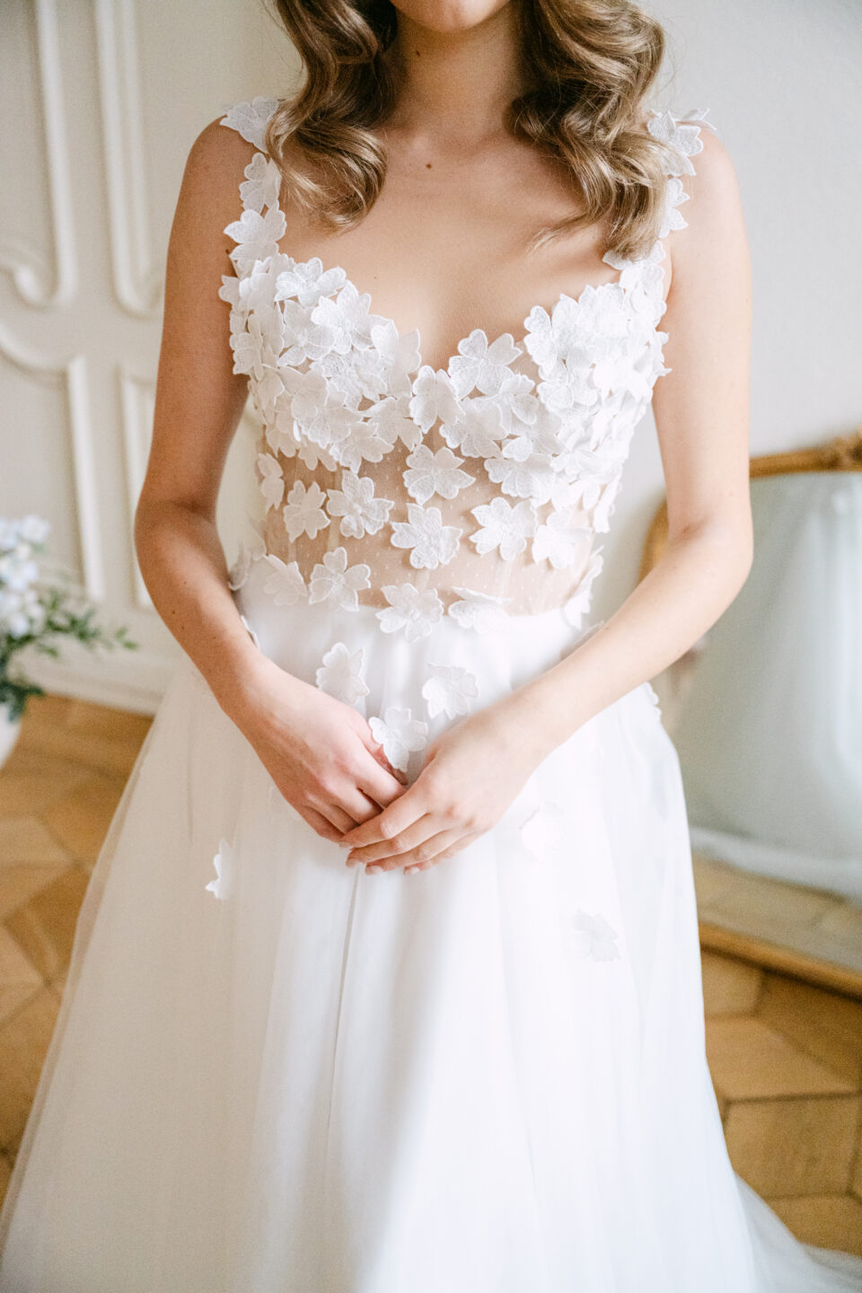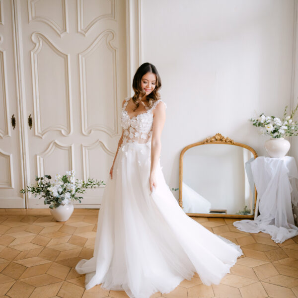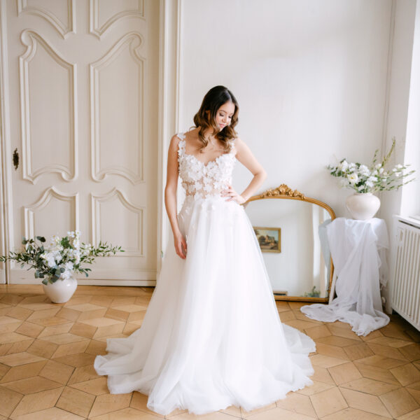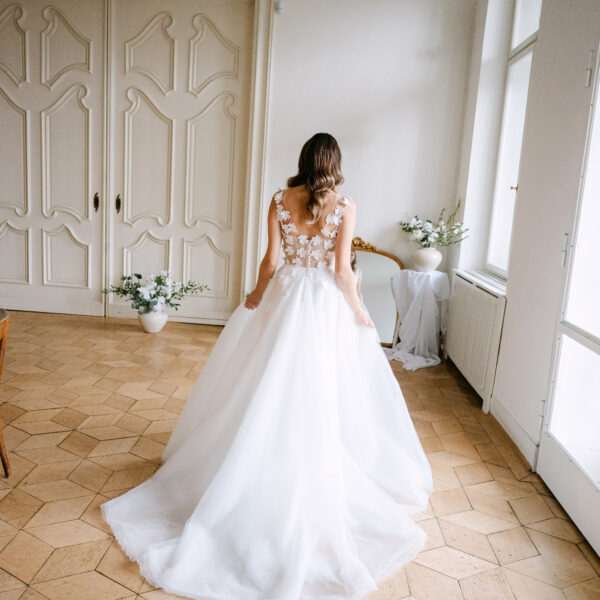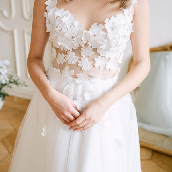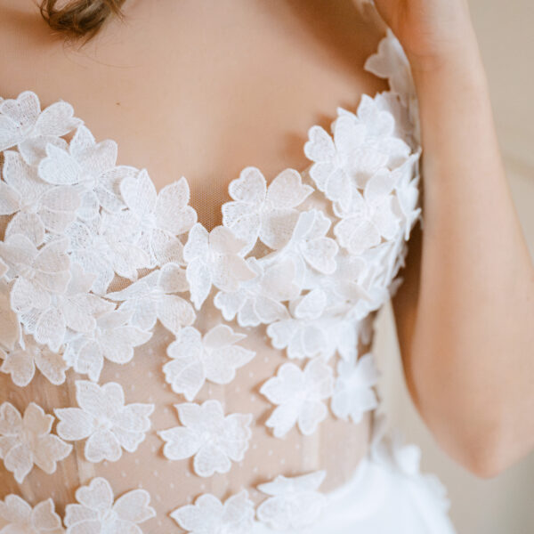 Das Brautkleid Betty überzeugt durch die romantischen 3D Blüten, die auf der gesamten Korsage verteilt sind. Angedeutete Carmenträger umschmeicheln die Schultern und weitere Blüten fließen sanft auf den weiten Rock aus ivory Tüll und Organza.
