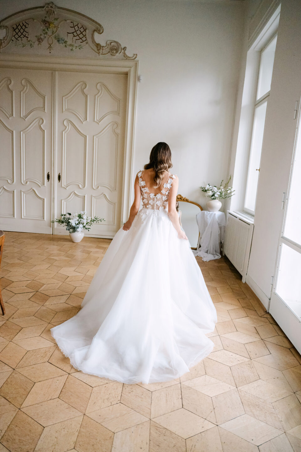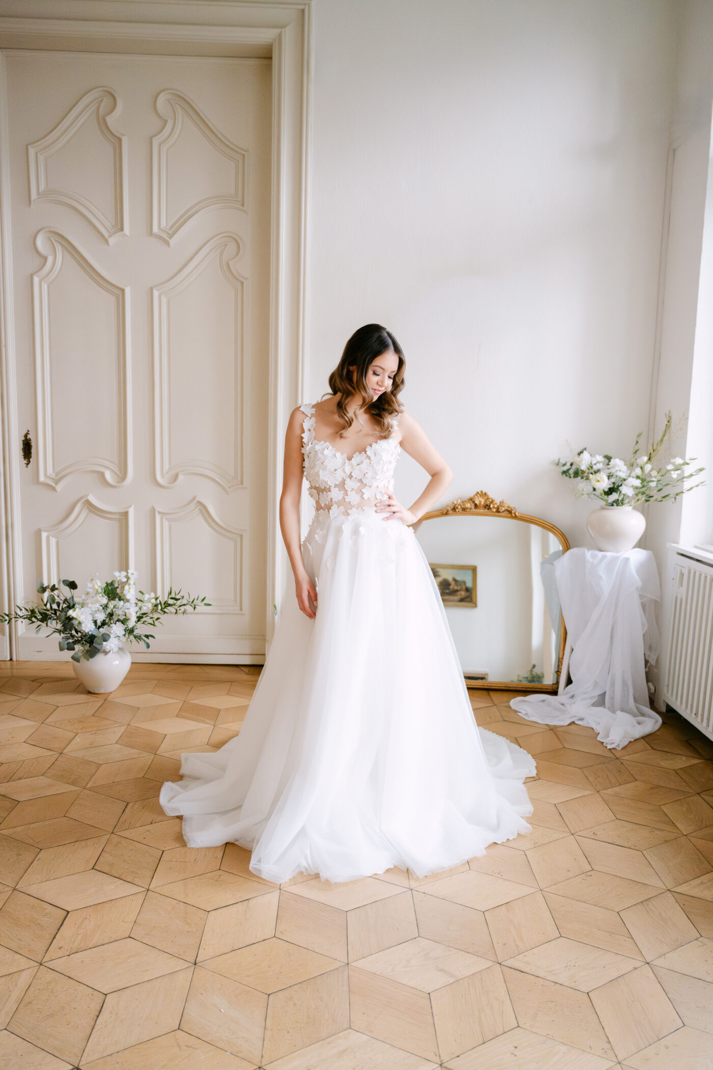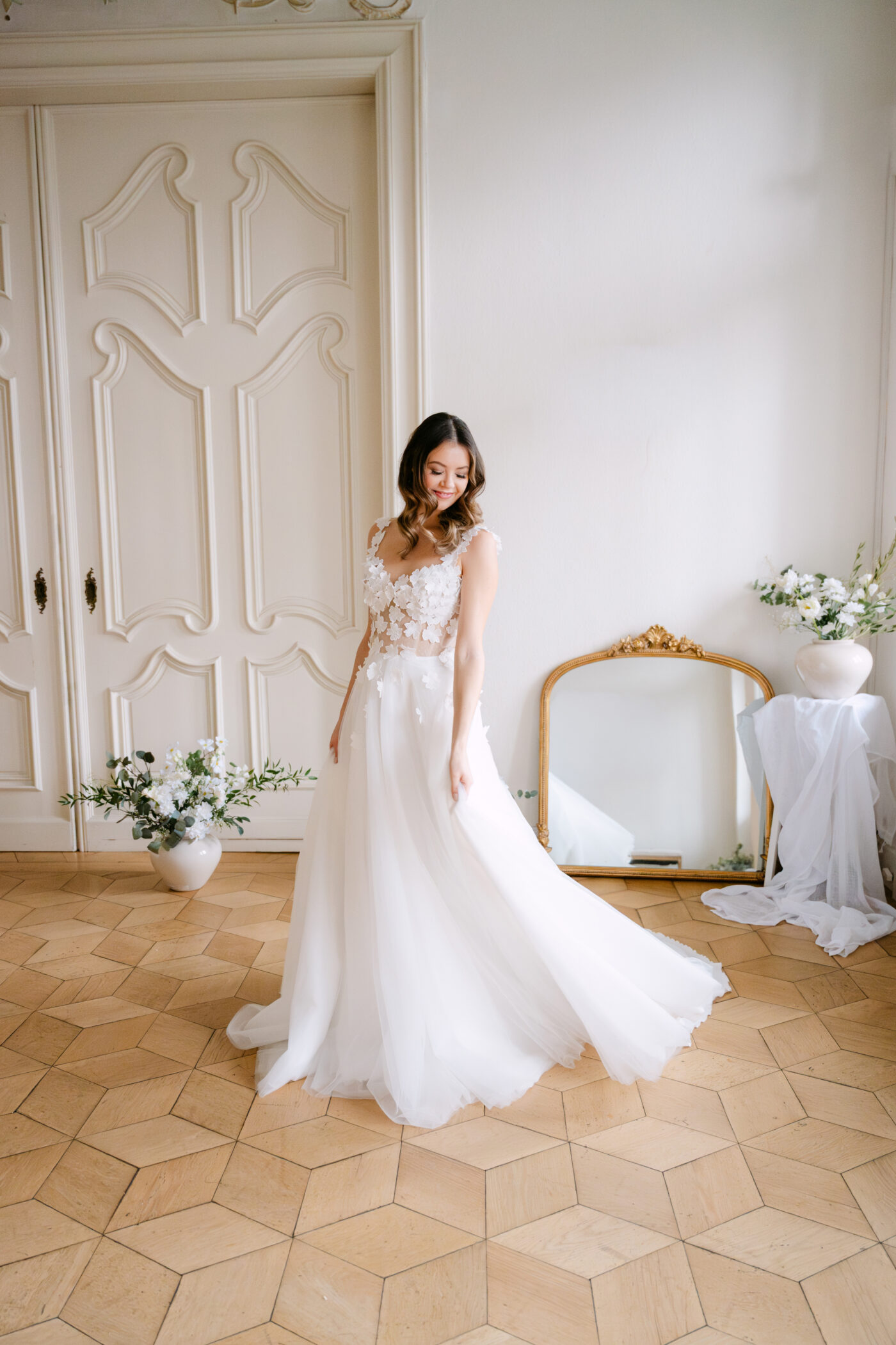 Das Brautkleid Betty überzeugt durch die romantischen 3D Blüten, die auf der gesamten Korsage verteilt sind. Angedeutete Carmenträger umschmeicheln die Schultern und weitere Blüten fließen sanft auf den weiten Rock aus ivory Tüll und Organza.