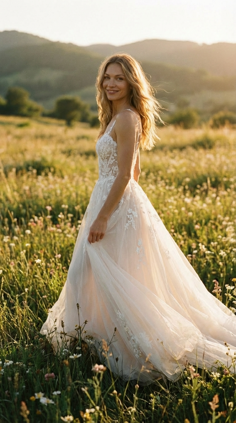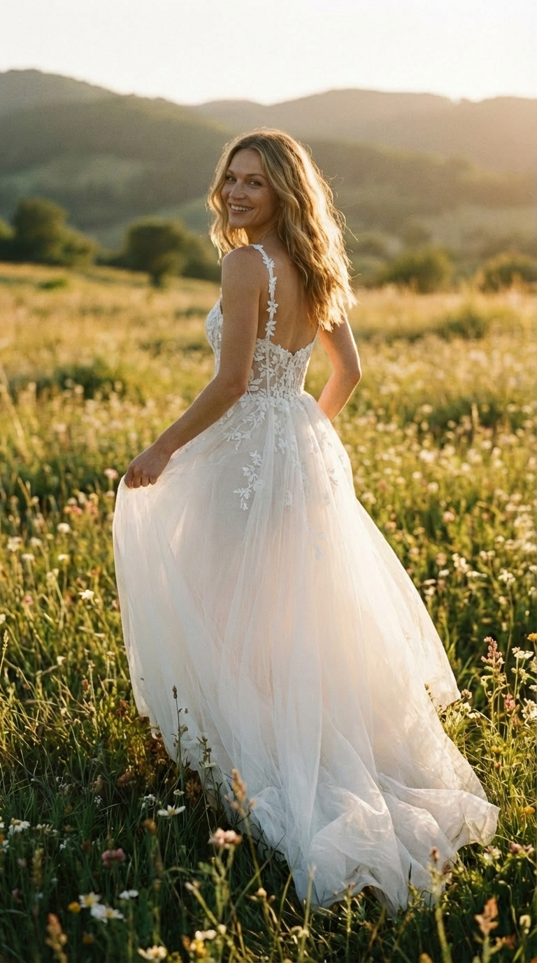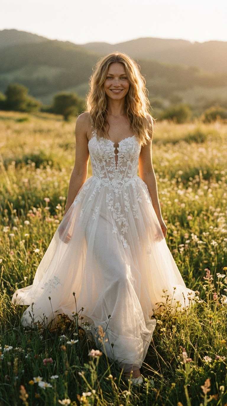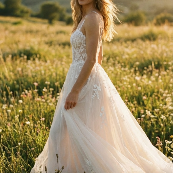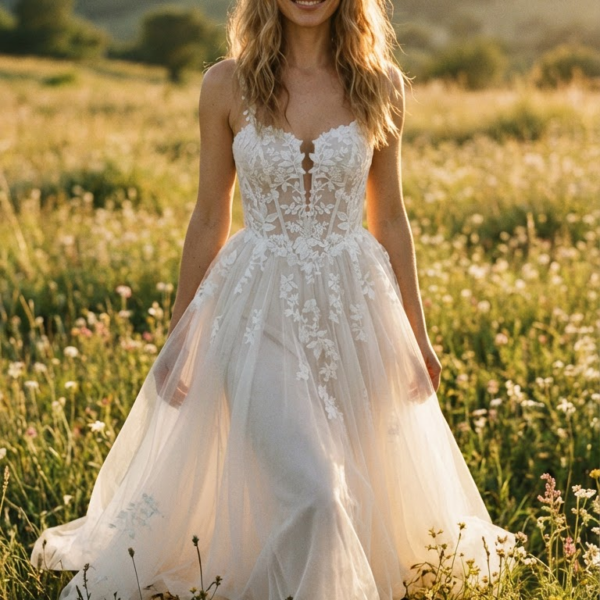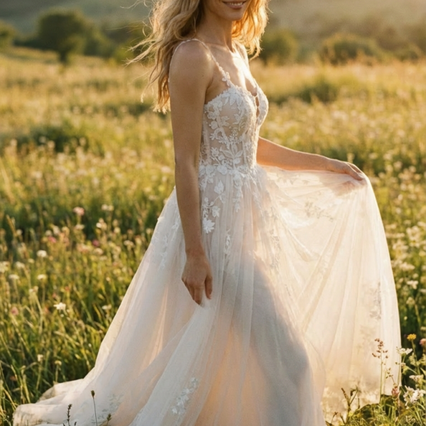 Brautkleid Bree vereint romantische Prinzessin mit verspielten Spitzenapplikationen und einem zarten Tüllrock. Das leicht transparente Oberteil mit tiefem Ausschnitt sorgt für eine moderne Note, während die schräg geschnittene Taille die Silhouette harmonisch betont. Abnehmbare Spitzenträger ermöglichen wahlweise eine klassische oder Carmen-Variante.