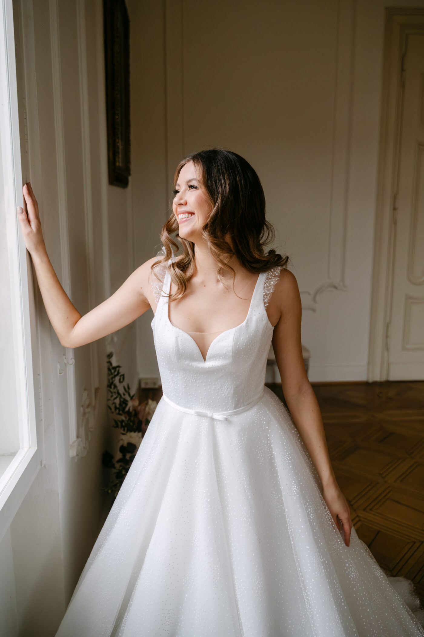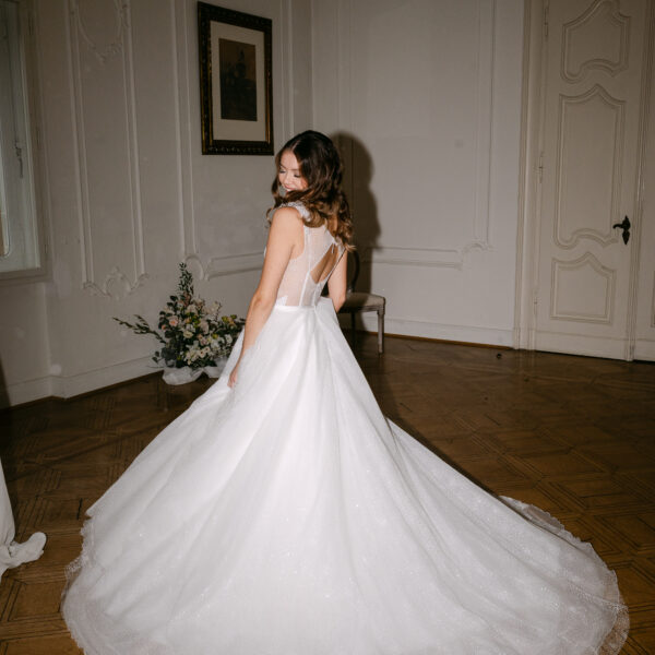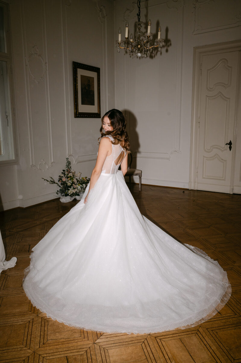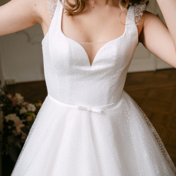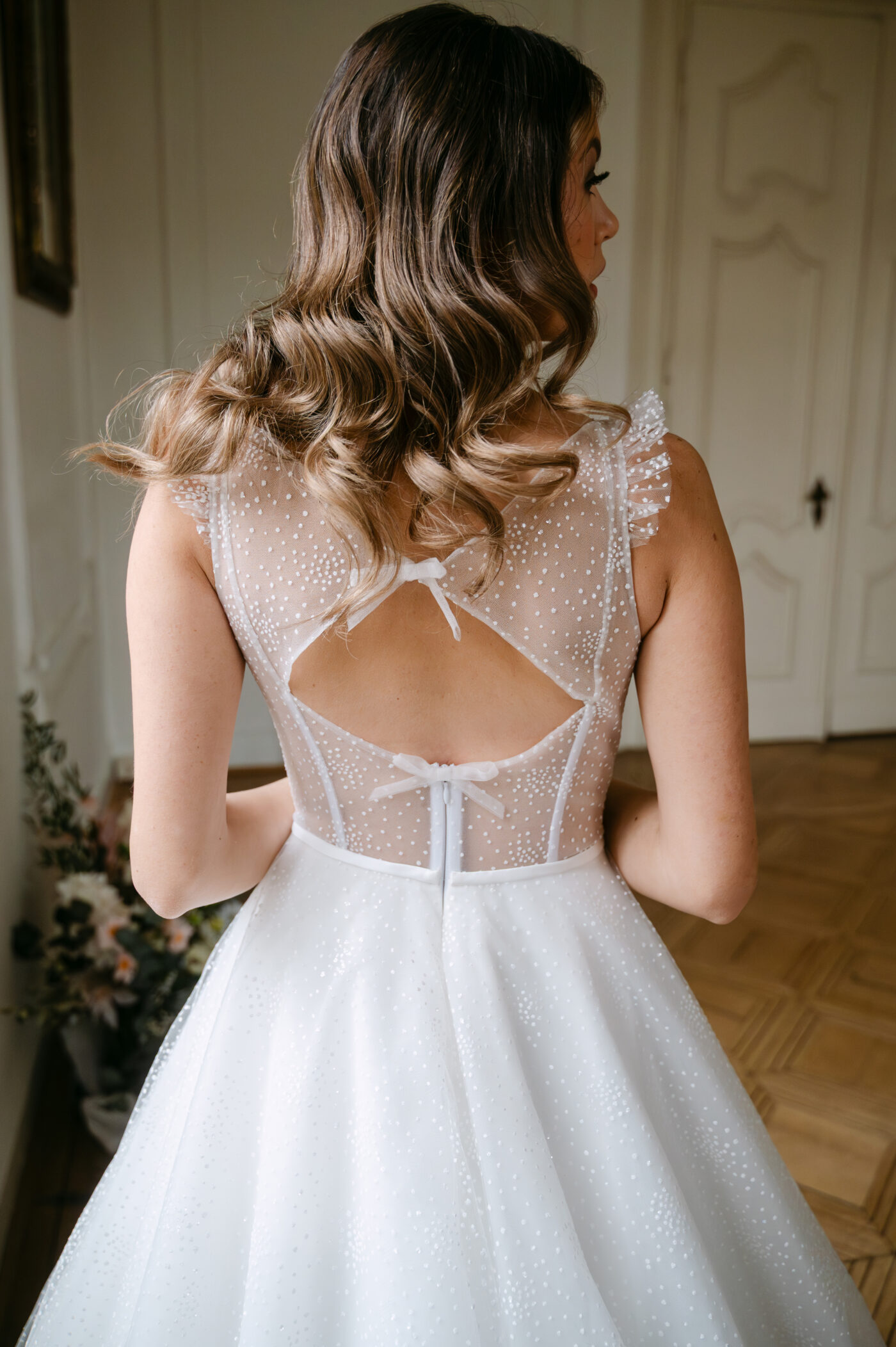 Die Kombination aus Glitzer und romantischen Details machen das Brautkleid ‘Carrie’ zu einem funkelnden Hingucker. Die glitzernden Pünktchen ziehen sich über das vorne unterlegte Oberteil, den transparenten Rücken und den mehrlagigen, weit ausgestellten Tüllrock. Besonders romantisch wird das Kleid durch den raffinierten Rückenausschnitt, der mit zarten Tüllschleifen geschlossen wird.