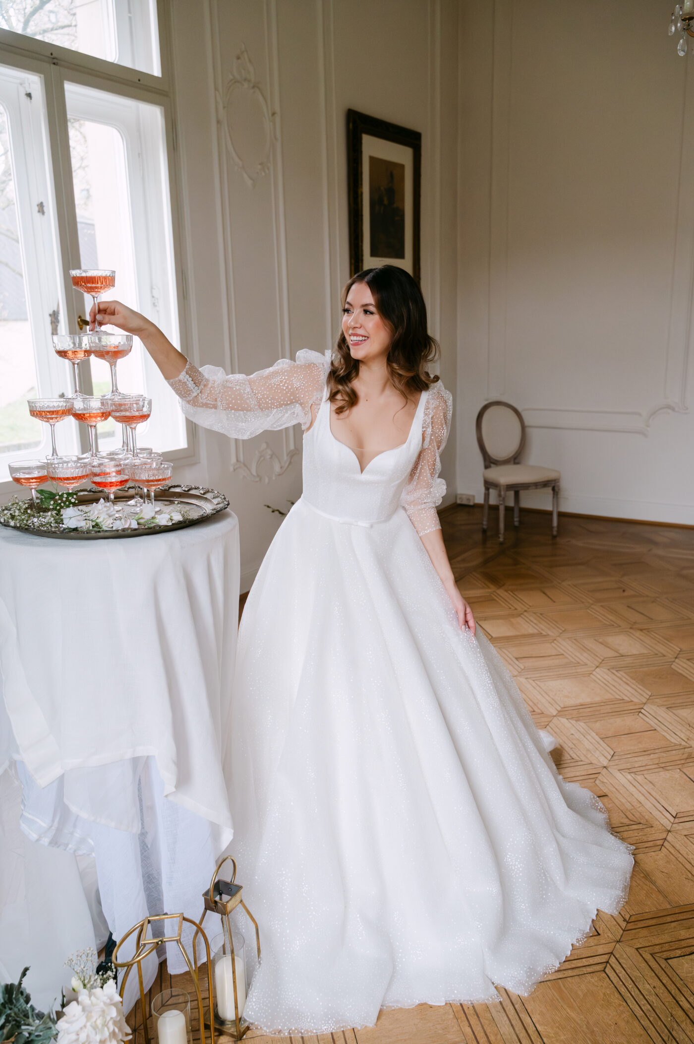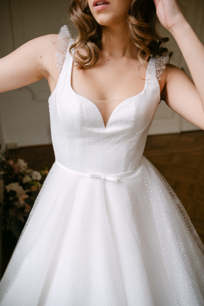 Dieses Kleid lässt sich nach deinen Wünschen mitgestalten. Beliebte Individualisierungen unserer Bräute sind z. B. Rocktausch, Ärmelvariationen oder Farbwechsel.