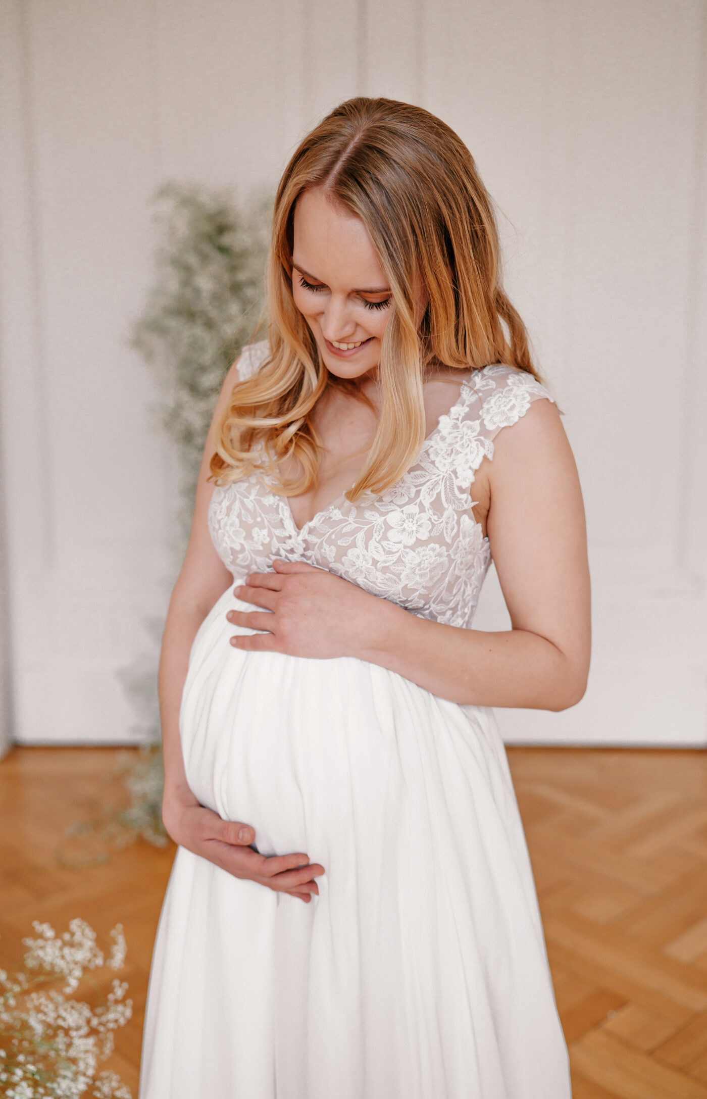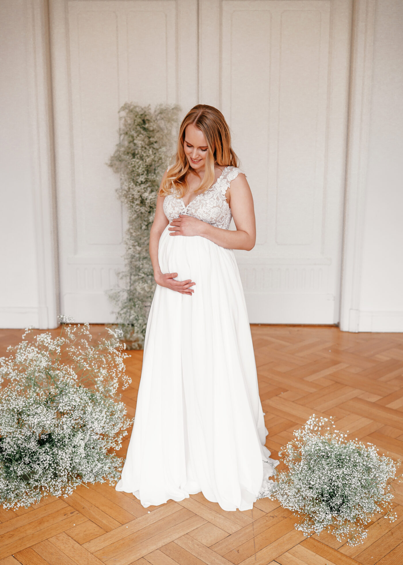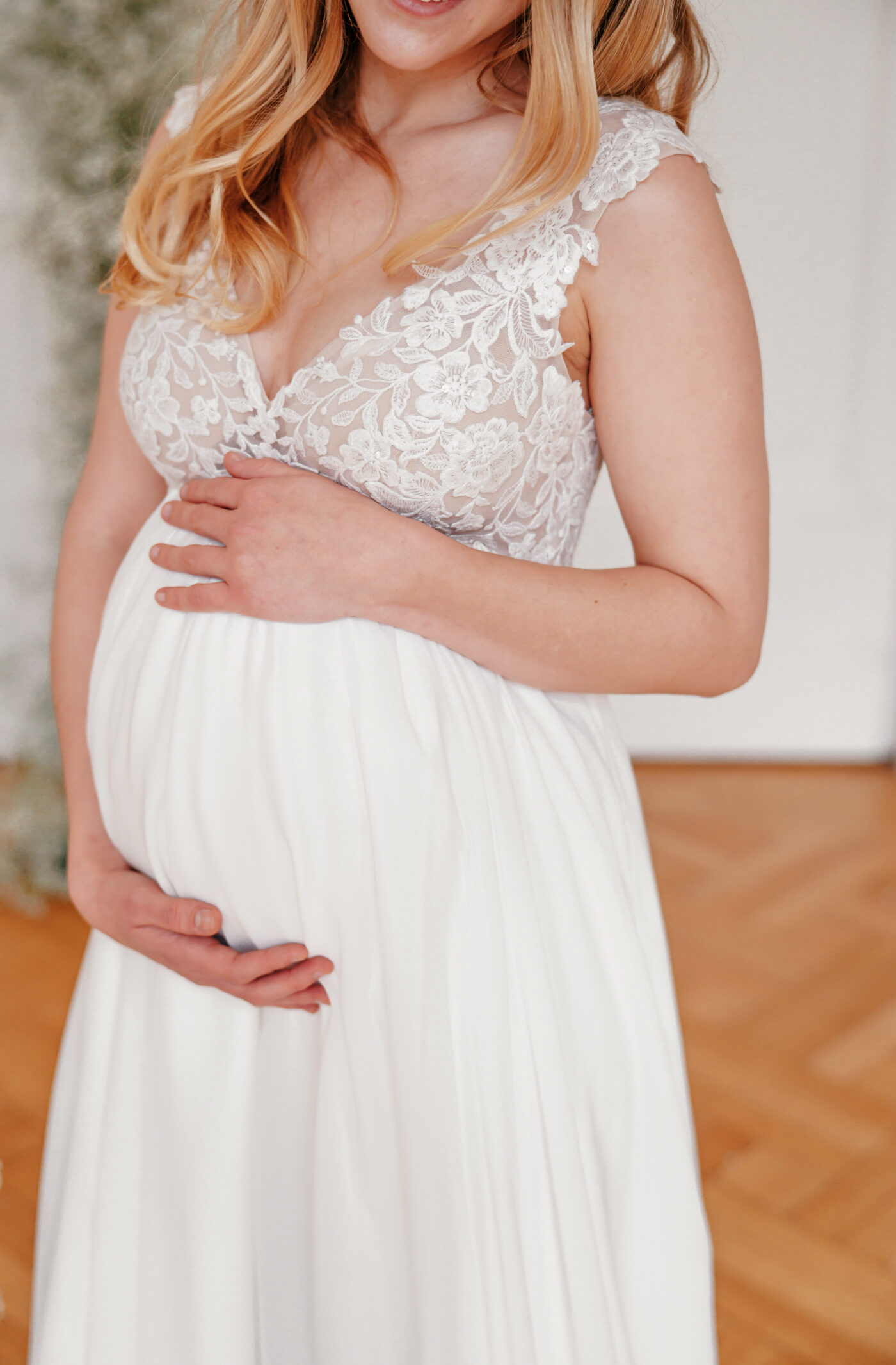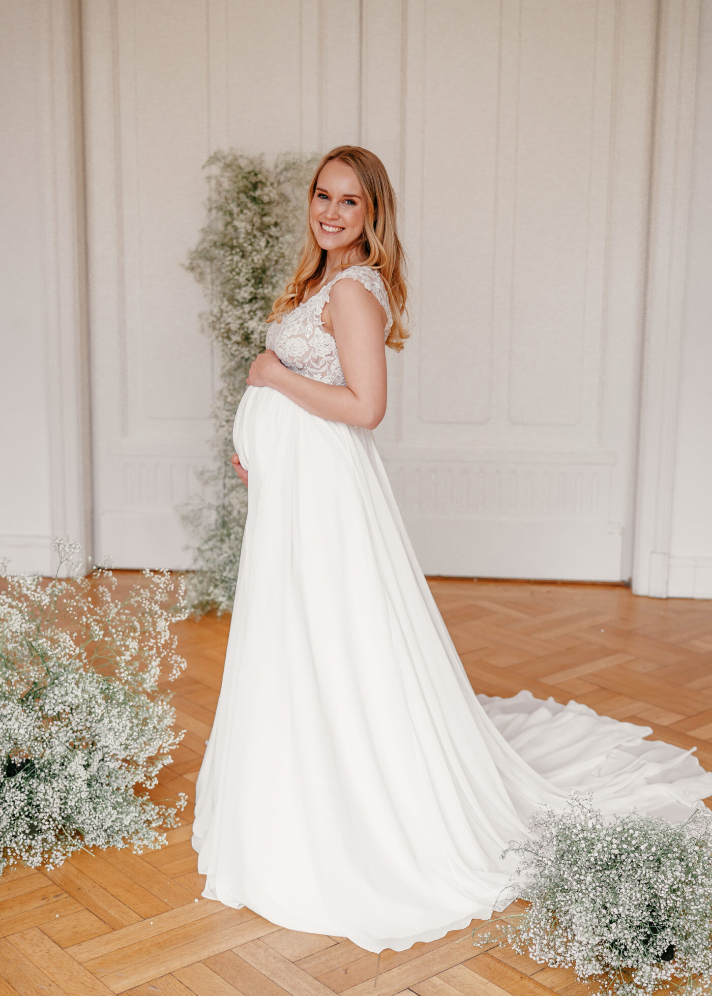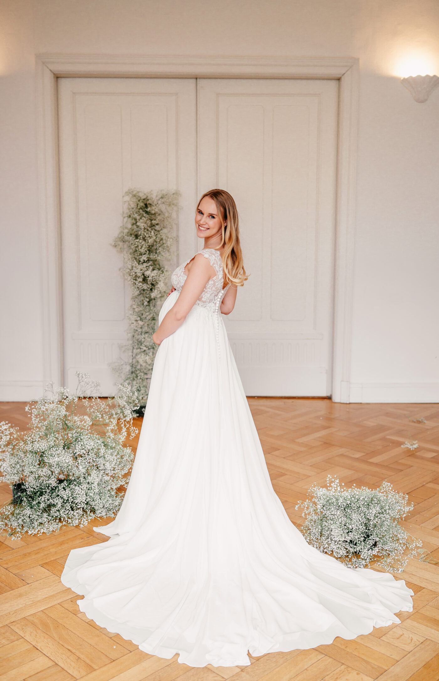 Dieses Design im Empire-Schnitt eignet sich perfekt für schwangere Bräute. Die breiten Träger bieten Halt und schmeicheln der Schulter, wohingegen der tiefe V-Ausschnitt das Dekolleté perfekt in Szene setzt. Zarte Pailletten bringen die romantisch florale Spitze zum Funkeln. Abgerundet wird dieses Design von einem zart fließenden Chiffonrock.