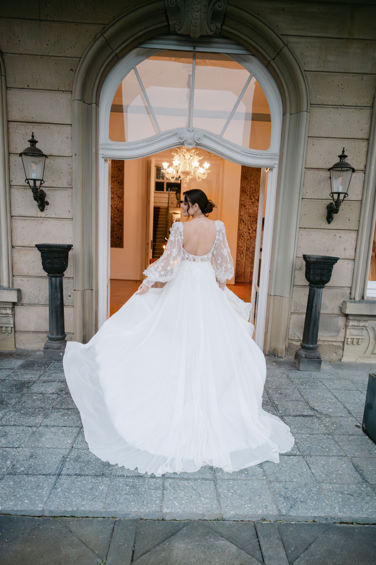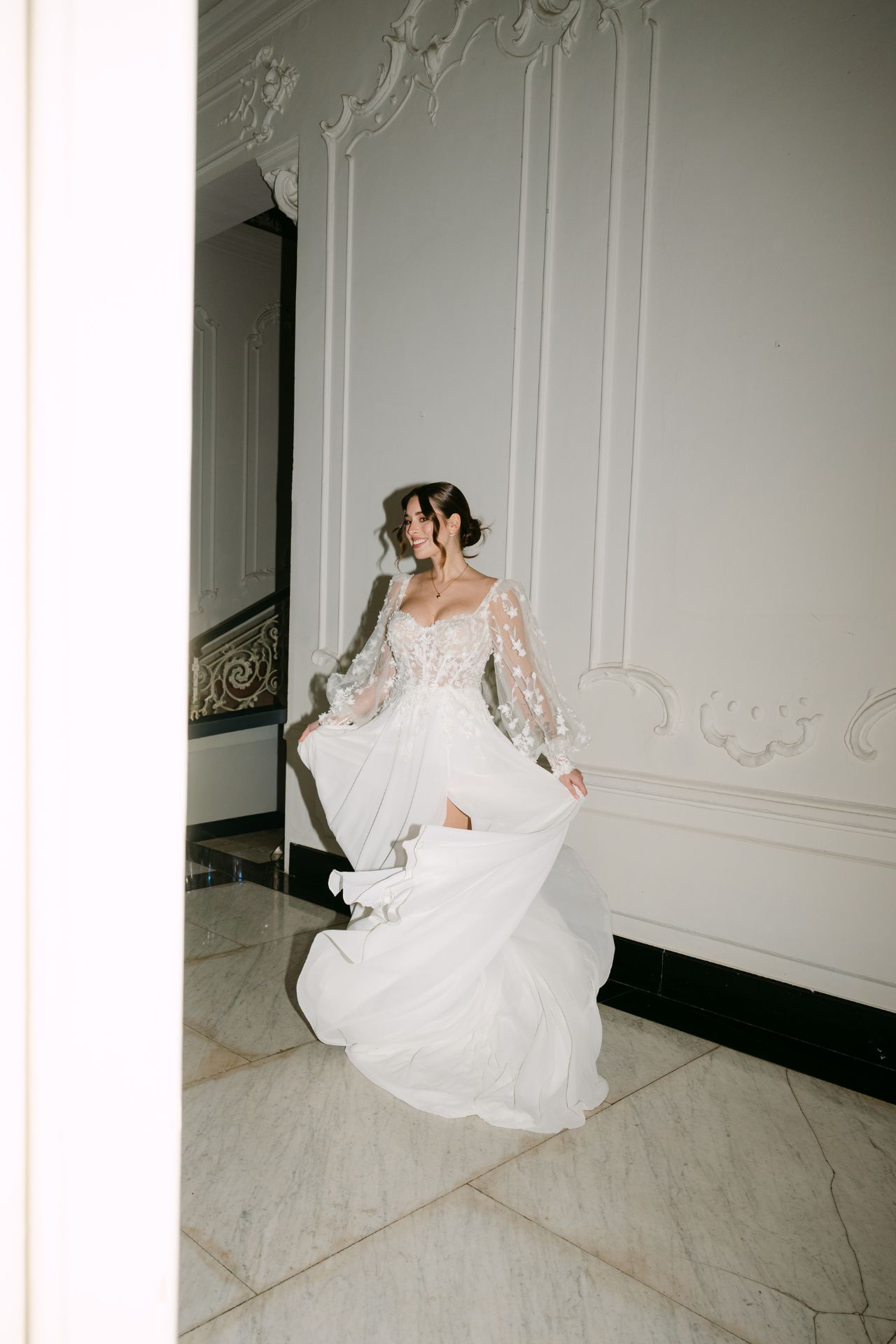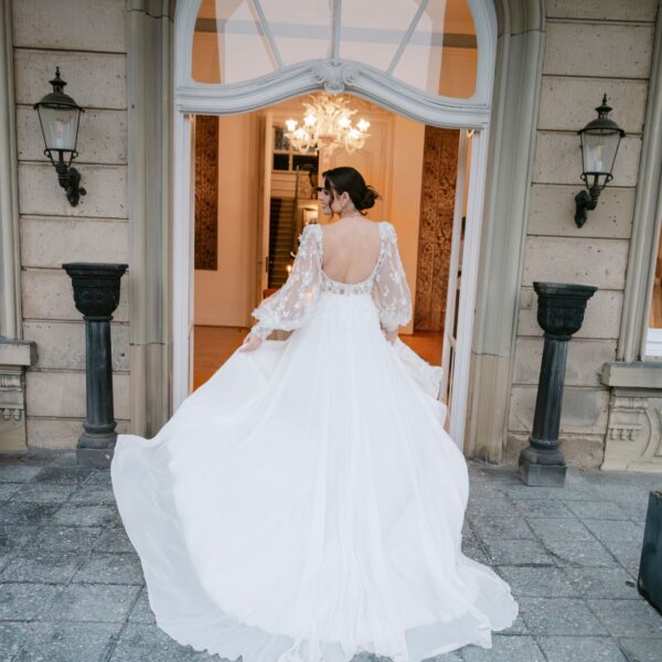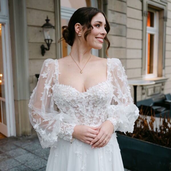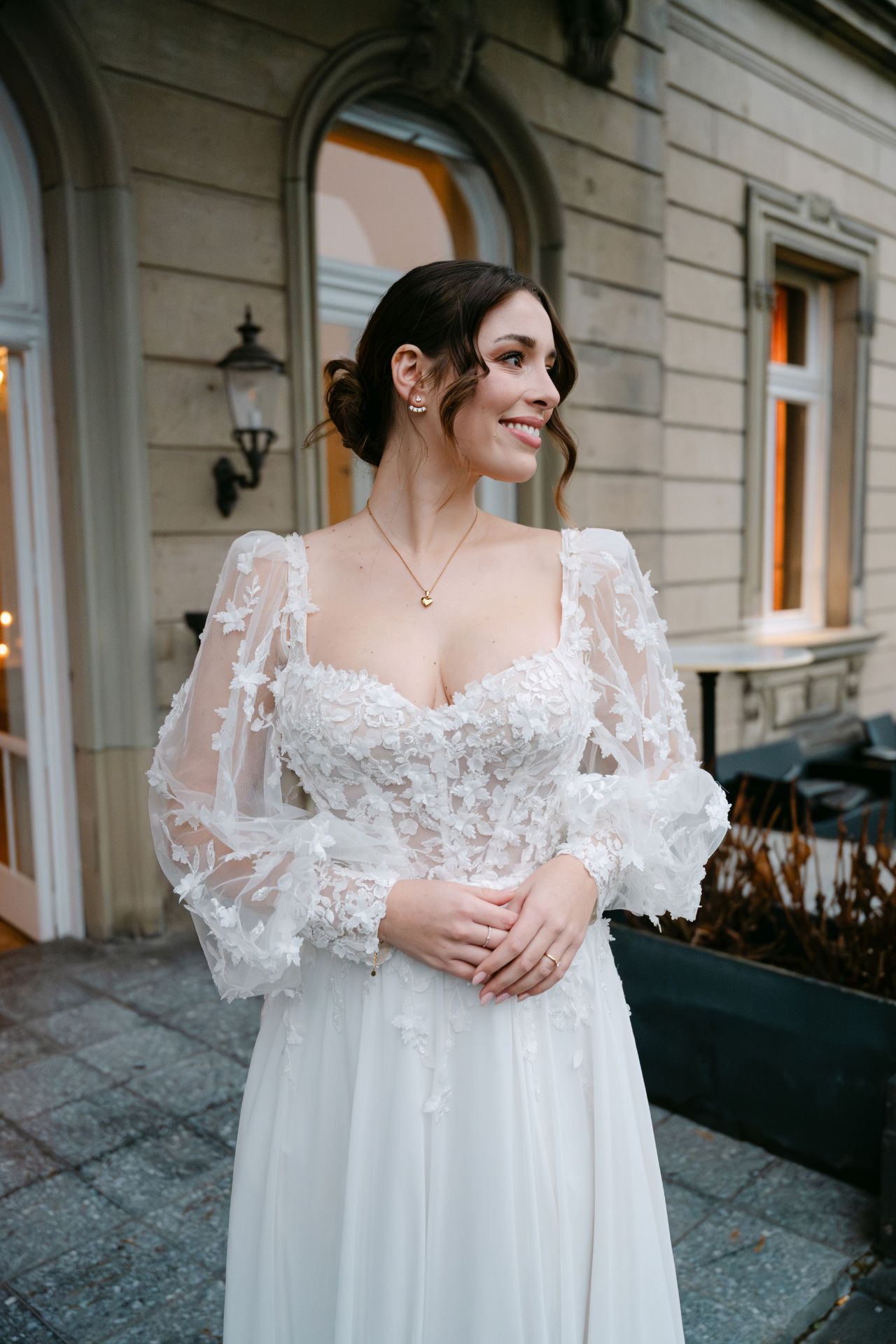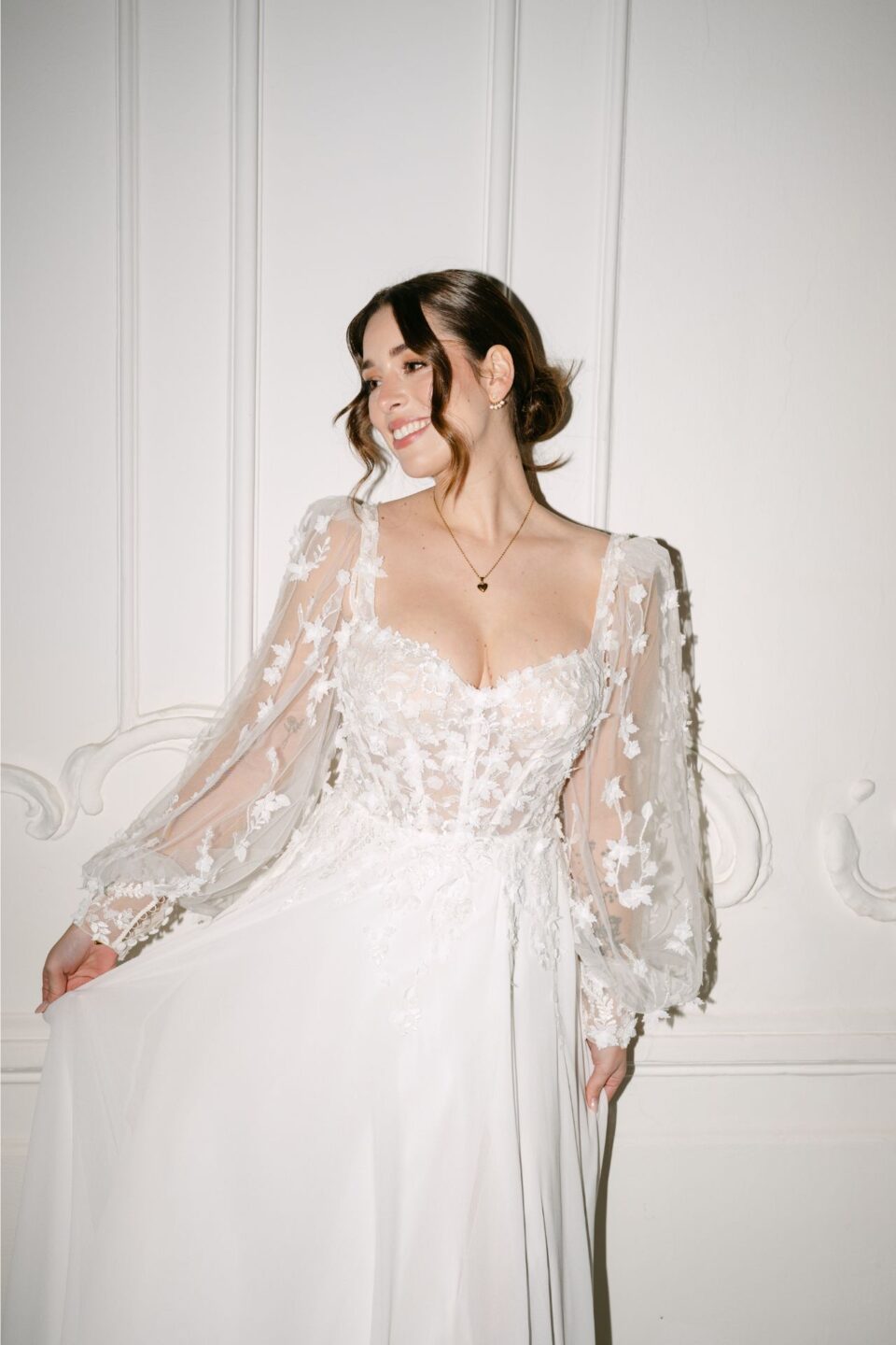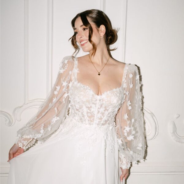 Dieses Kleid besticht durch einen Sweetheart-Ausschnitt und eine Korsagenoptik mit sichtbaren Stäbchen. Die romantische 3D-Blütenspitze verläuft verspielt in den Rock und verleiht dem Design eine besondere Note. Für zusätzliche Vielseitigkeit besteht die Option, lange Ärmel hinzuzufügen. Der leichte Chiffonrock wird durch aufregende Schlitzdetails ergänzt, die dem Kleid eine moderne und elegante Ausstrahlung verleihen.
