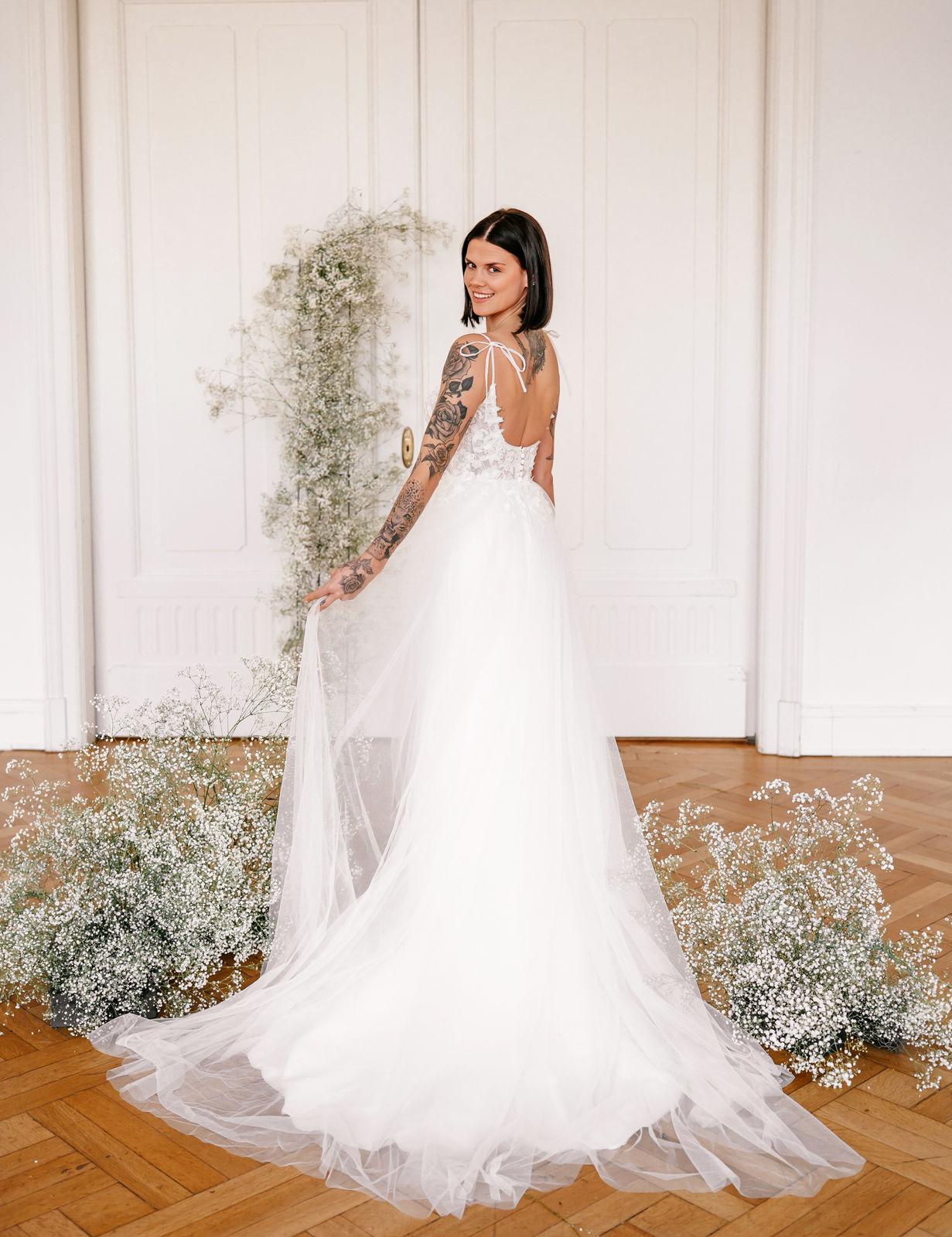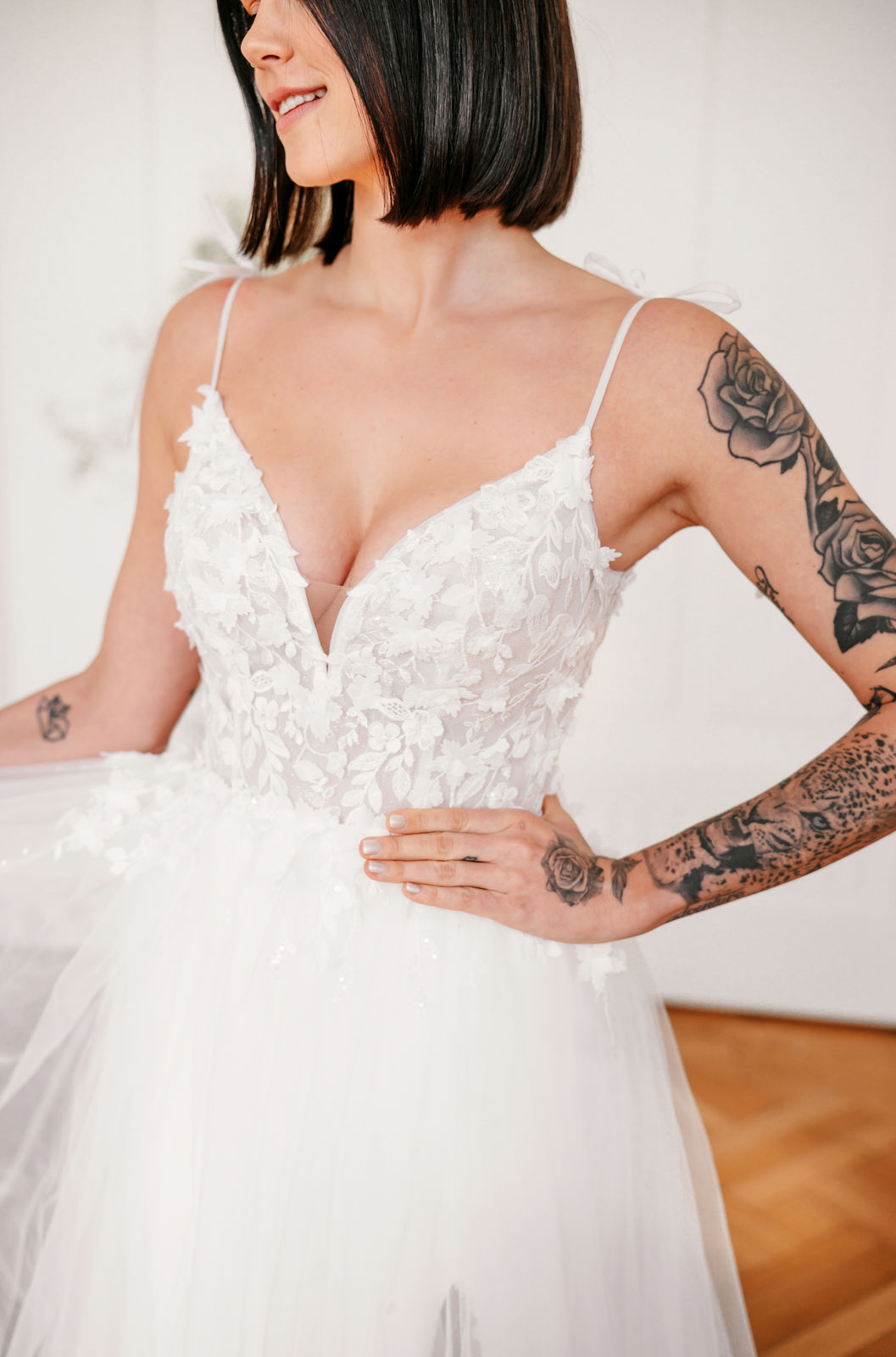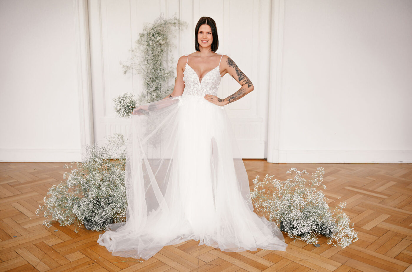 Gwen ist ein besonders wandelbares Design. Die filigrane 3D-Blütenspitze fließt vom transparenten Oberteil am Beinschlitz des figurbetonten Rock aus Crèpe entlang und setzt ihn so perfekt in Szene. Zarte Tüllträgerchen setzen einen schönen Schleifenakzent auf den Schultern. Ein Highlight ist der optionale, abnehmbare Überrock aus Tüll.