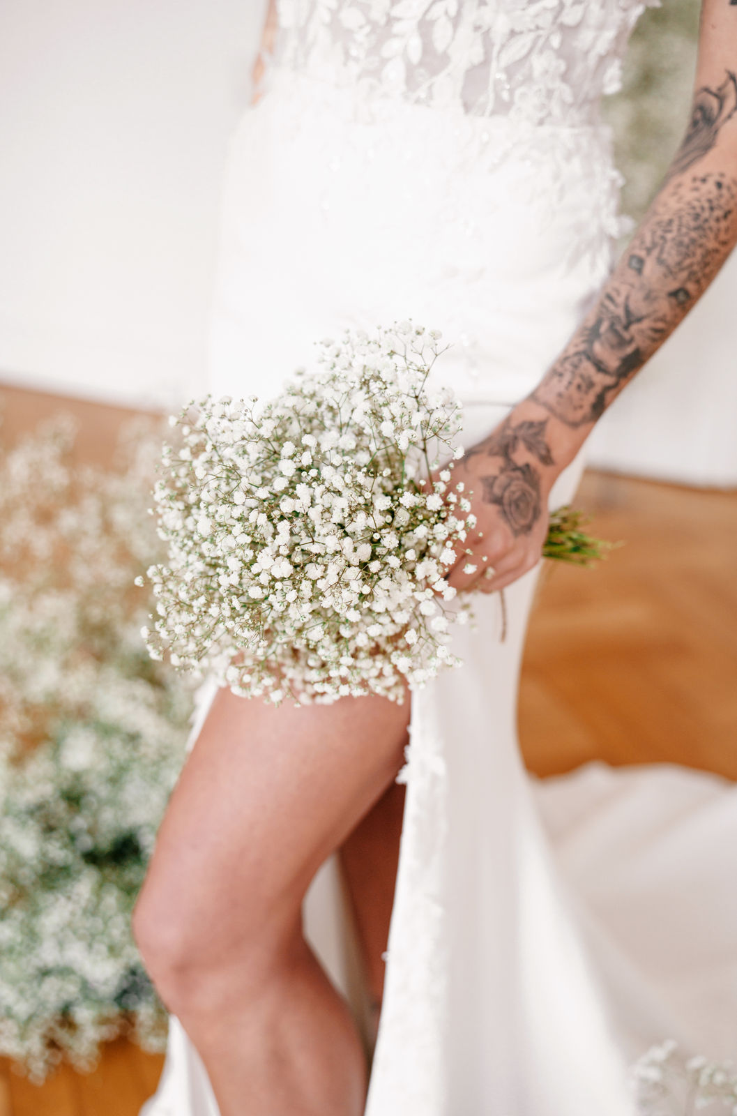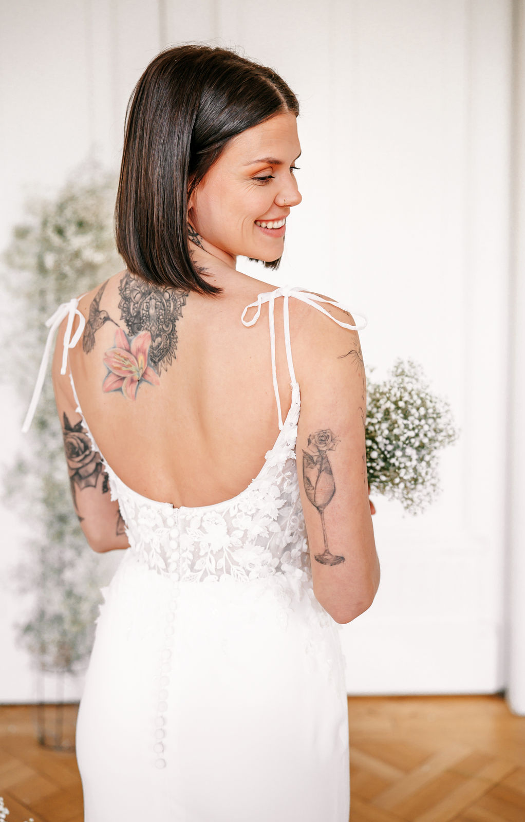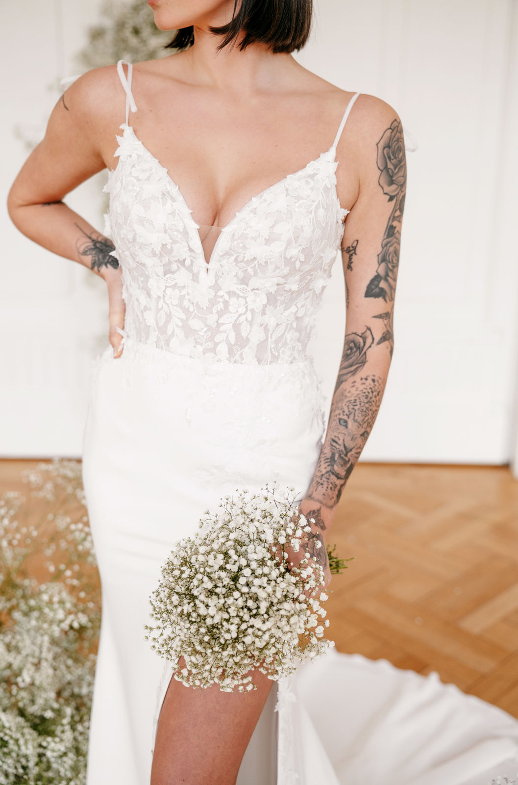 Gwen ist ein besonders wandelbares Design. Die filigrane 3D-Blütenspitze fließt vom transparenten Oberteil am Beinschlitz des figurbetonten Rock aus Crèpe entlang und setzt ihn so perfekt in Szene. Zarte Tüllträgerchen setzen einen schönen Schleifenakzent auf den Schultern. Ein Highlight ist der optionale, abnehmbare Überrock aus Tüll.