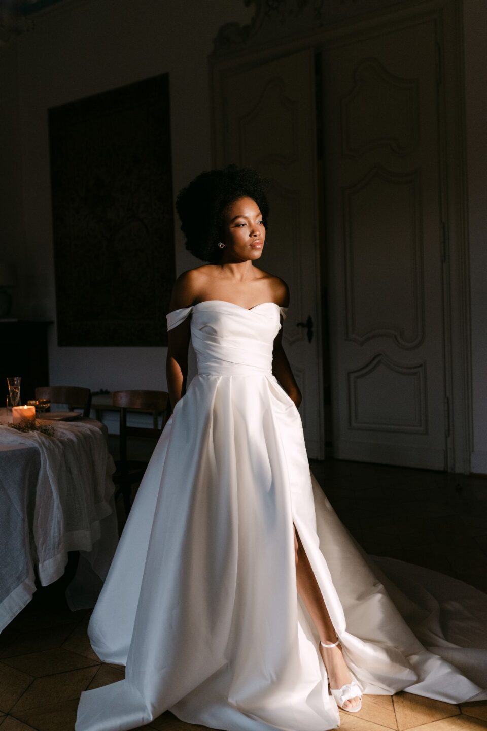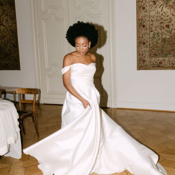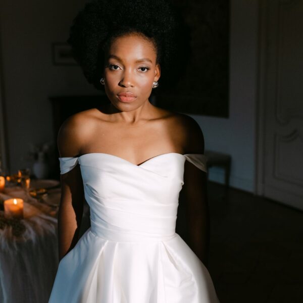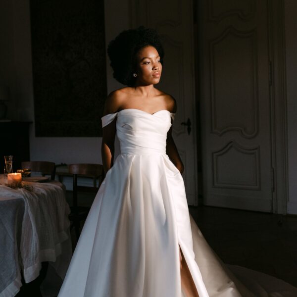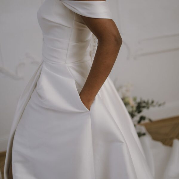 Dieses anmutige A-Linien-Design aus Mikado-Satin überzeugt mit einem trägerlosen Oberteil und mit einem zarten Herzausschnitt. Die Eleganz des Kleides wird durch einen raffinierten, asymmetrischen Faltenwurf im Oberteil und die Drapierung des Rocks mit einem Beinschlitz unterstrichen. Die praktischen Taschen im Rock verleihen dem Kleid nicht nur eine moderne Note, sondern bieten auch eine funktionale und stilvolle Ergänzung.
