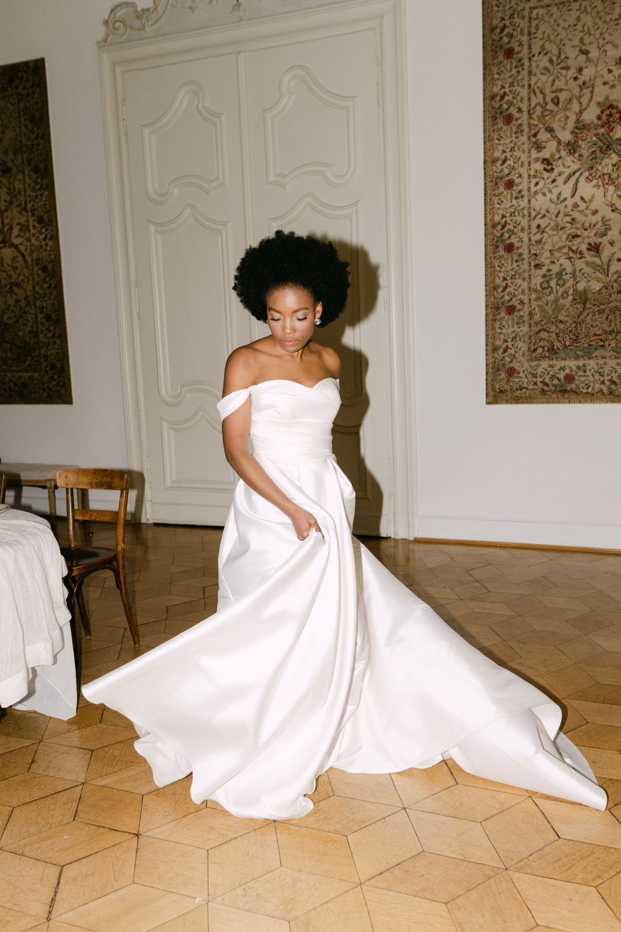 Dieses Kleid lässt sich teilweise mitgestalten. Beliebte Individualisierungen unserer Bräute sind z. B. Ärmelvariationen oder Farbwechsel. Je nach Verfügbarkeit auch vergünstigt zur Direktmitnahme möglich.