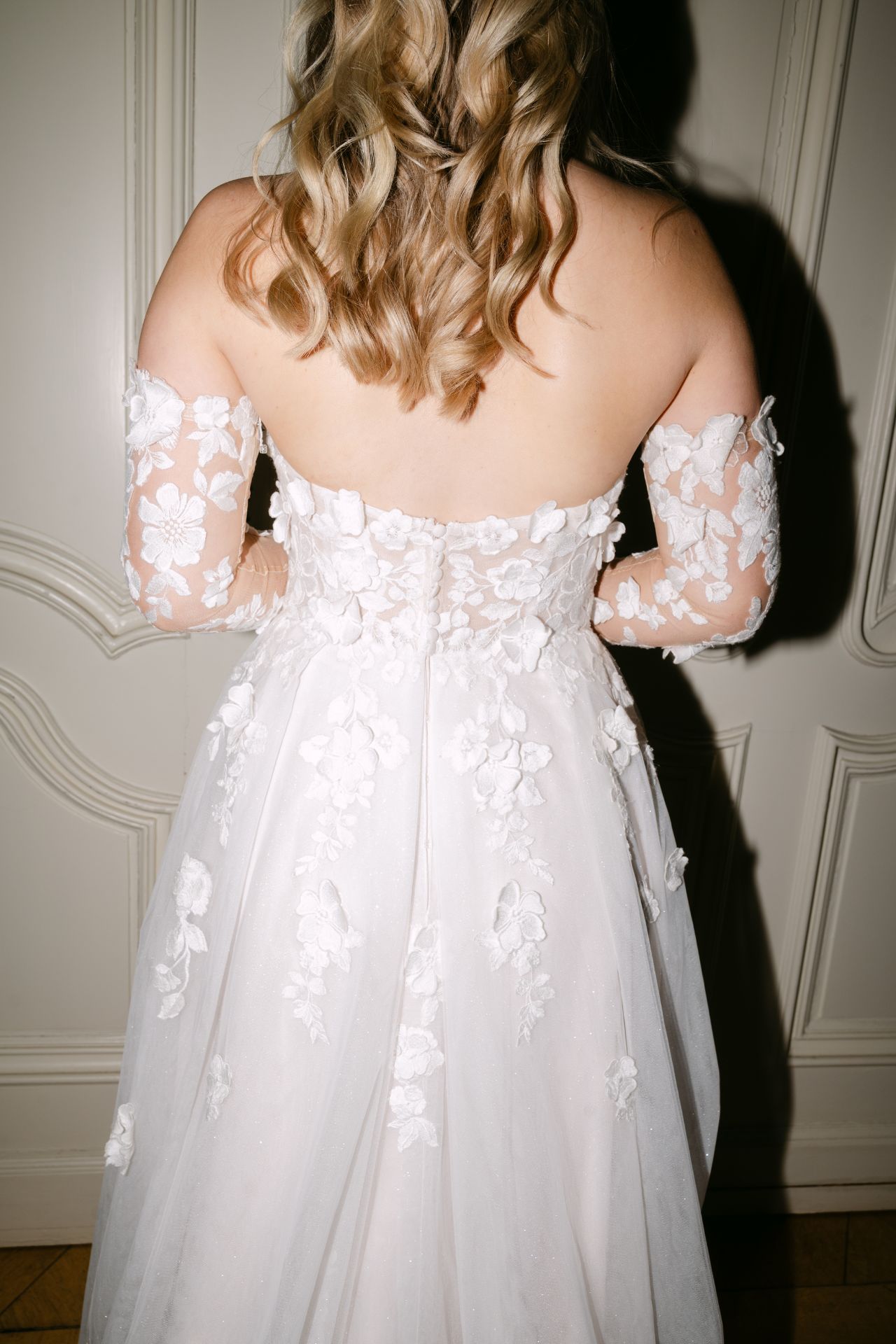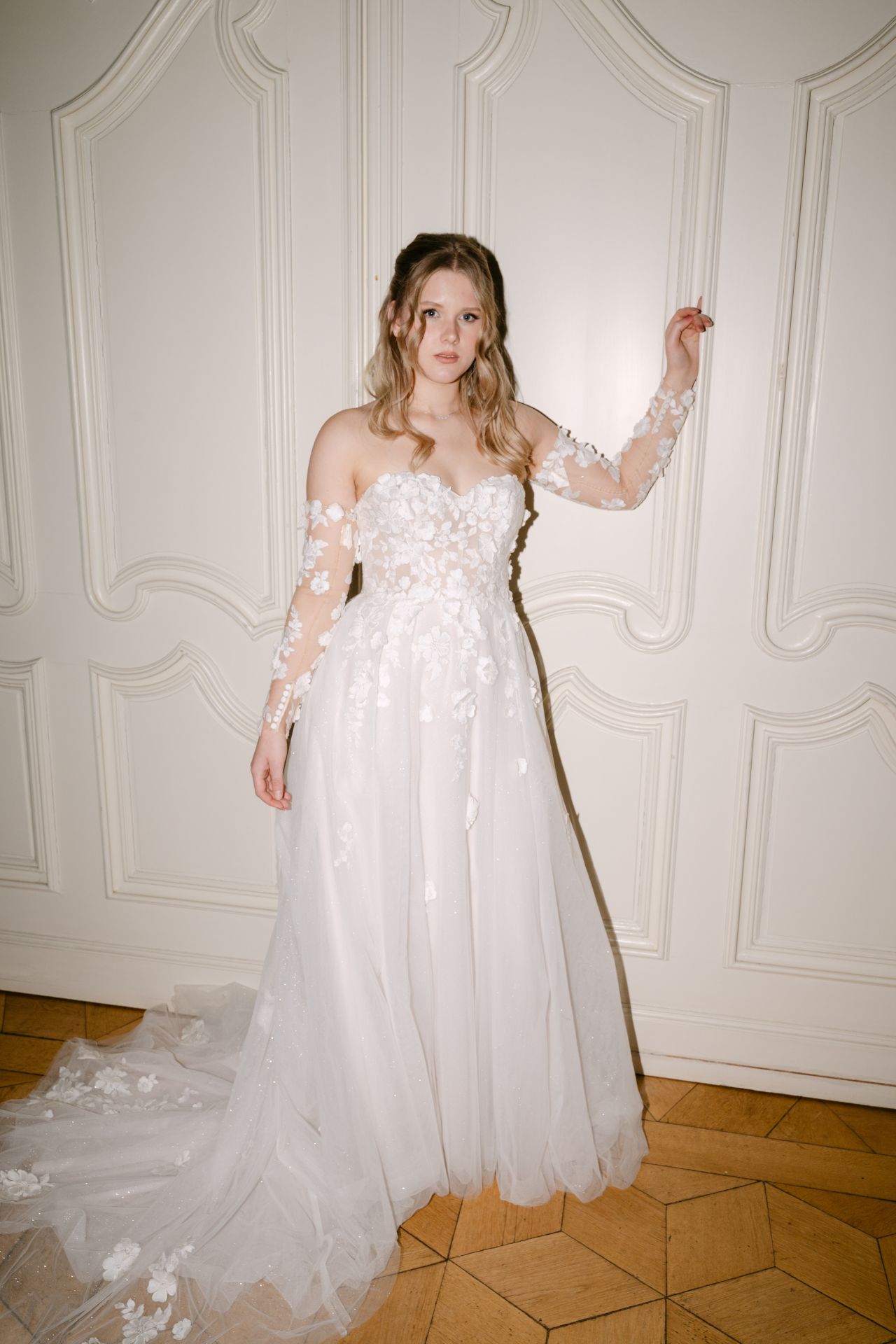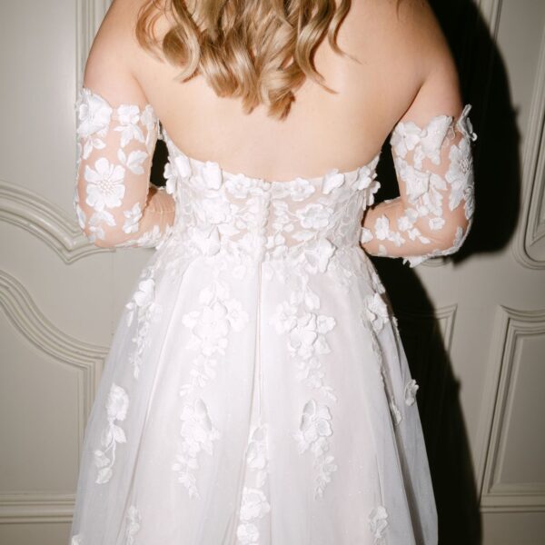 Dieses trägerlose Corsagen-A-Linien-Kleid bezaubert mit romantischen 3D-Blüten, die nahtlos in den Rock übergehen. Der Tüllrock in Sandfarbe ist mit Glitzertüll verziert und verfügt über einen verführerischen Beinschlitz. Optional können lange Ärmel dem Kleid hinzugefügt werden, um dem Gesamtbild eine vielseitige Note zu verleihen. Insgesamt entsteht so ein harmonisches und elegantes Design.