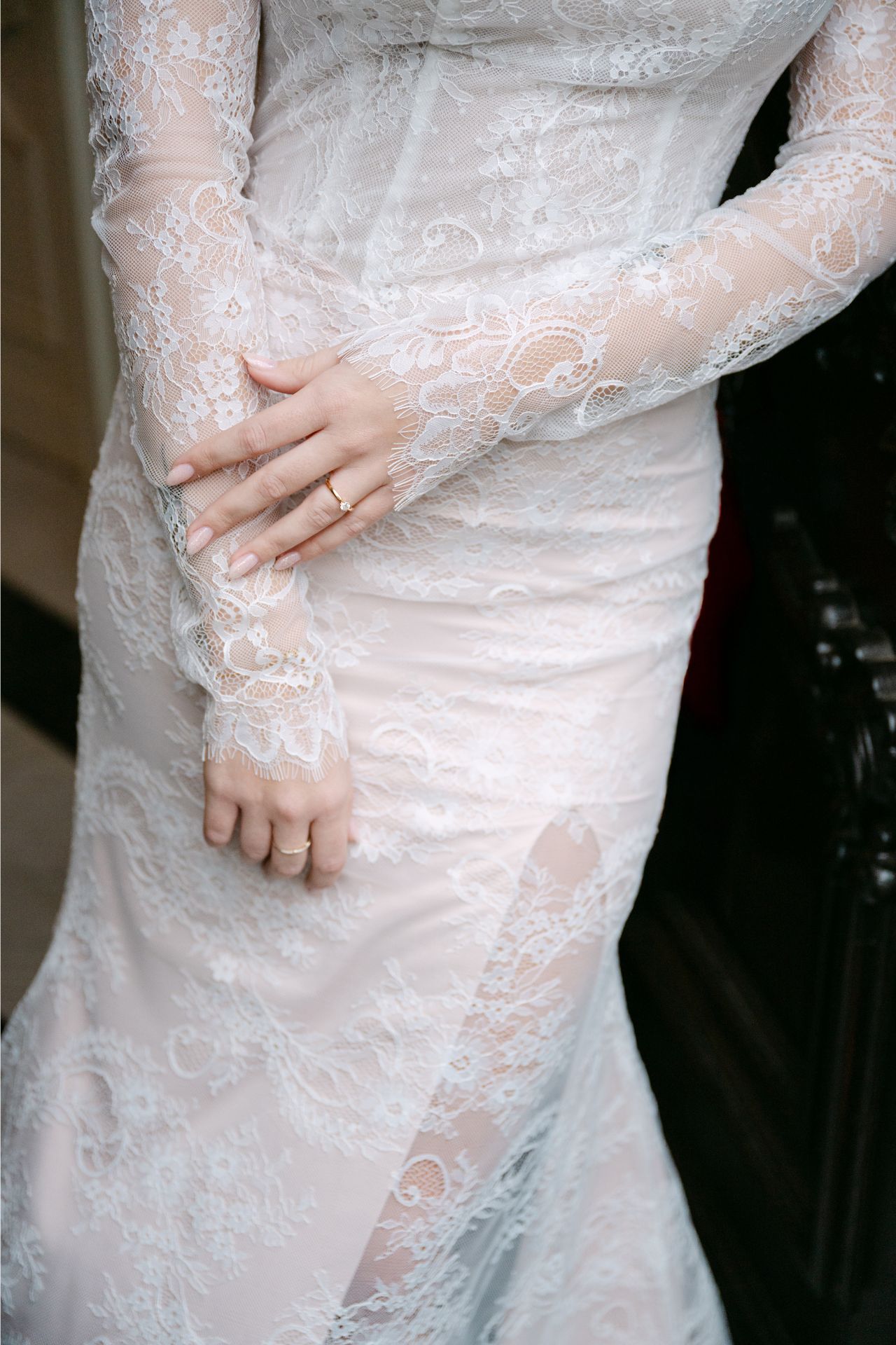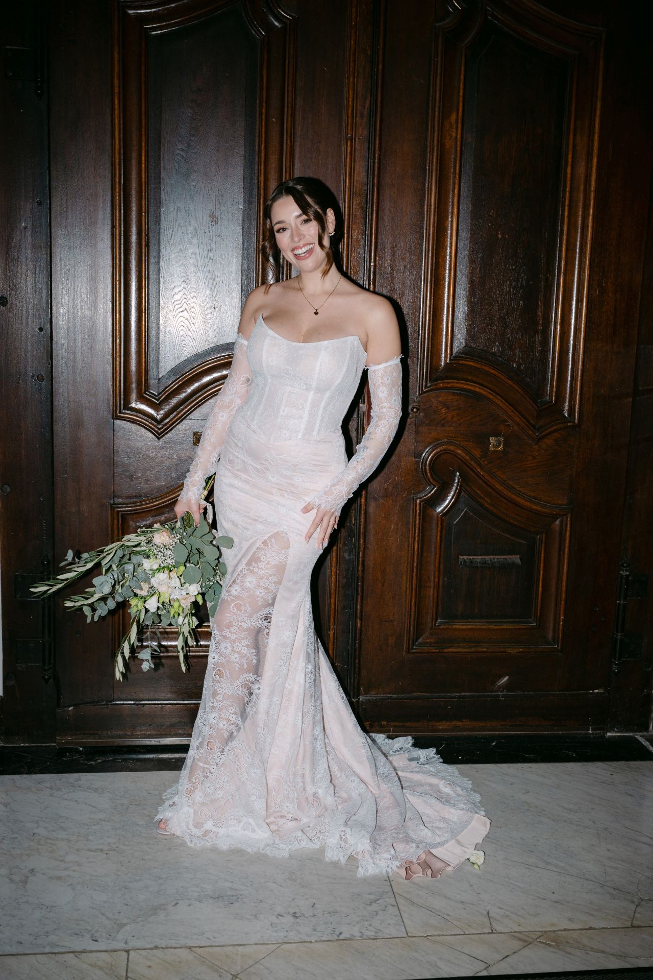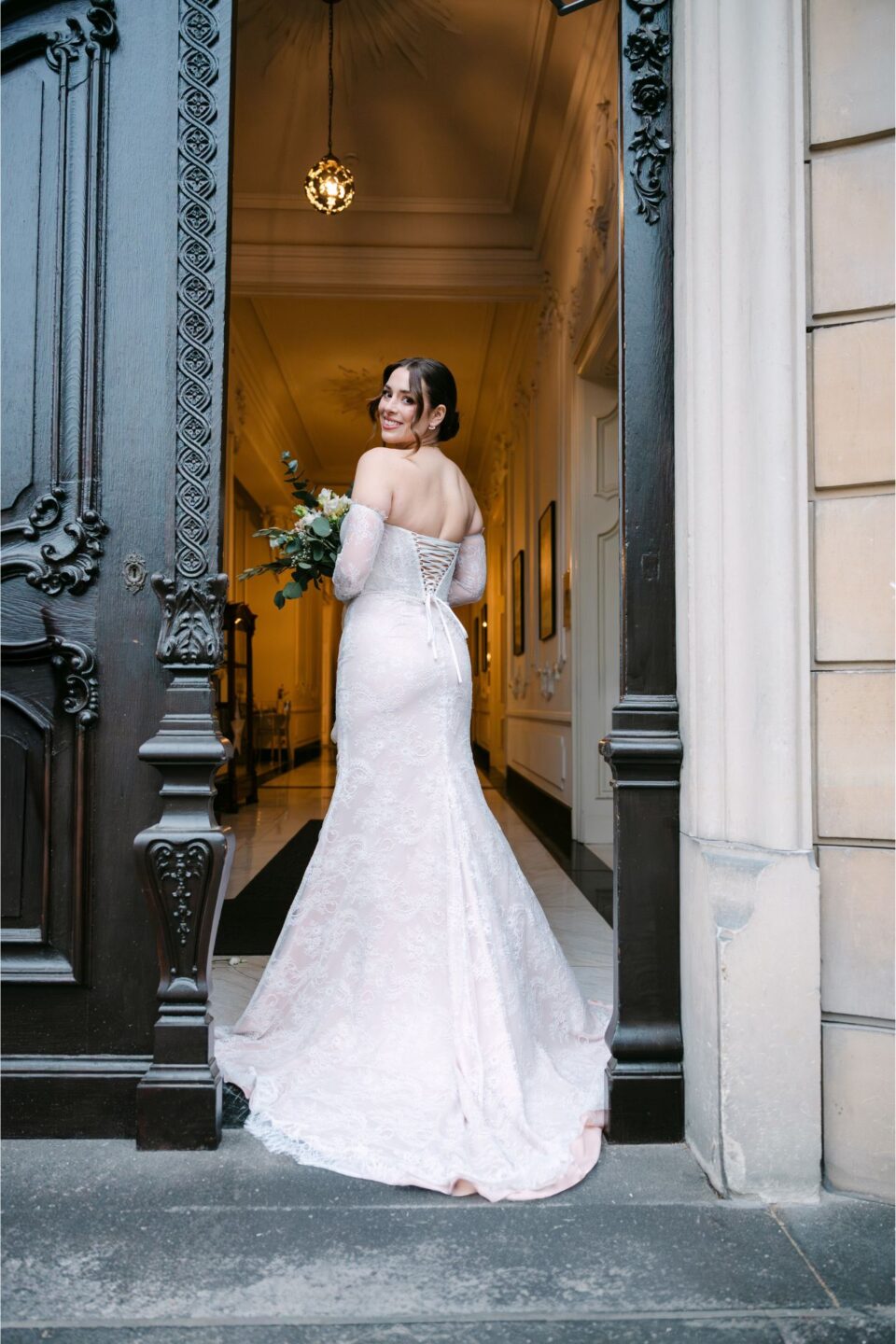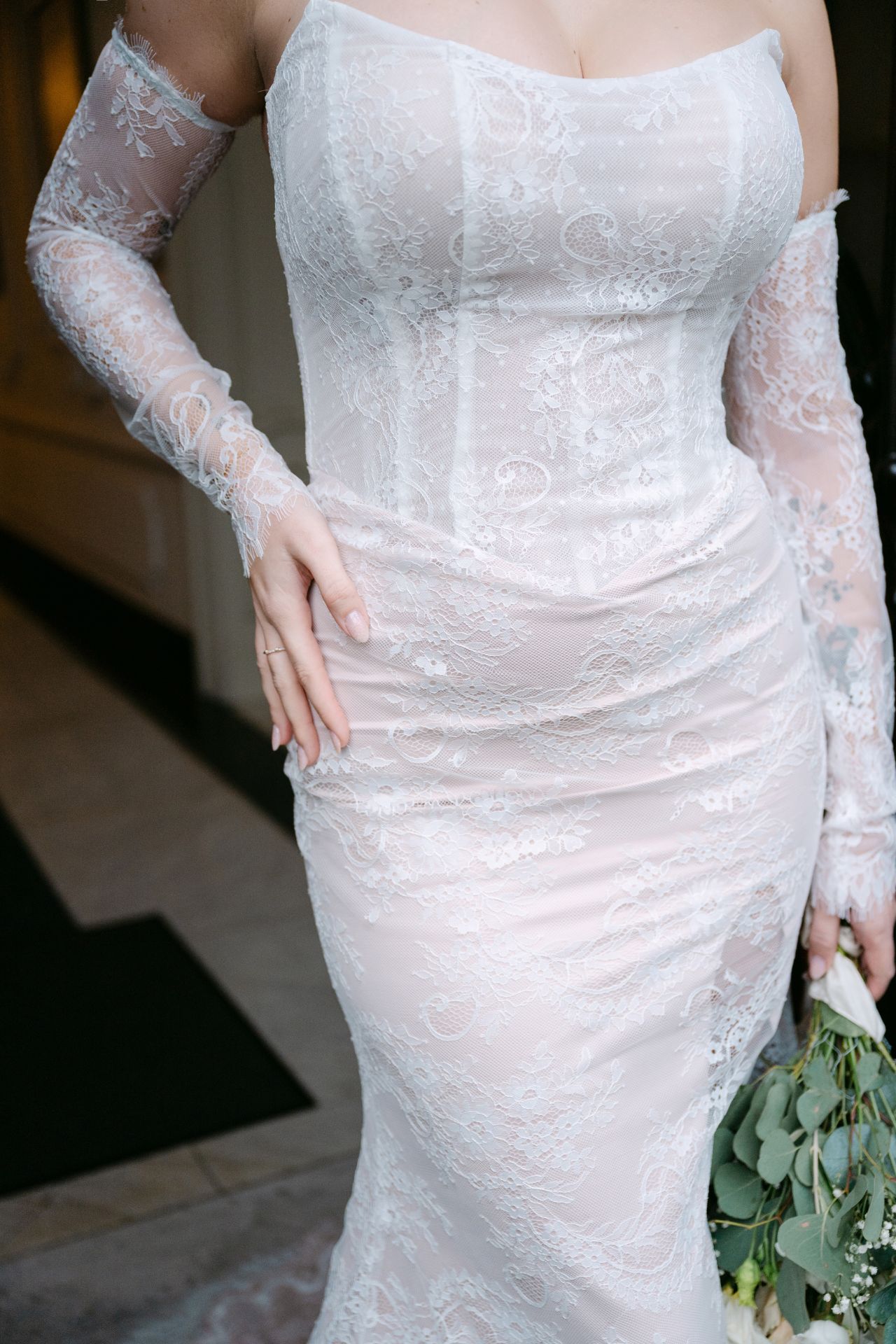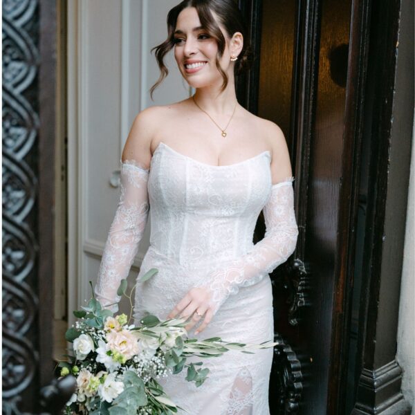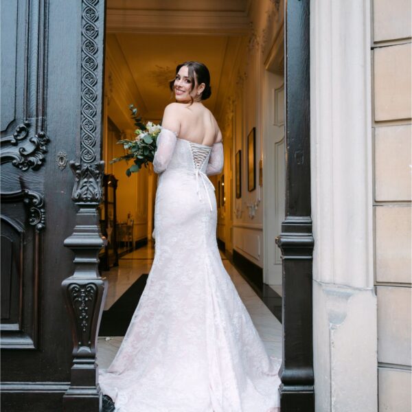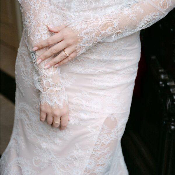 Dieses blush-farbene, eng anliegende Brautkleid bekommt durch die Chantilly-Spitze einen besonders eleganten und aufregenden Stil. Der Fit and Flare Schnitt mit hohem Beinschlitz schmiegt sich sinnlich an die Silhouette an und verleiht ihr dadurch einen besonders femininen Look. Optional können Spitzenärmel hinzugefügt werden, die dem Kleid eine romantische Note geben. Für noch mehr Individualität kann die Spitze auf Wunsch ausgetauscht werden – perfekt, um das Kleid ganz deinen Vorstellungen anzupassen.