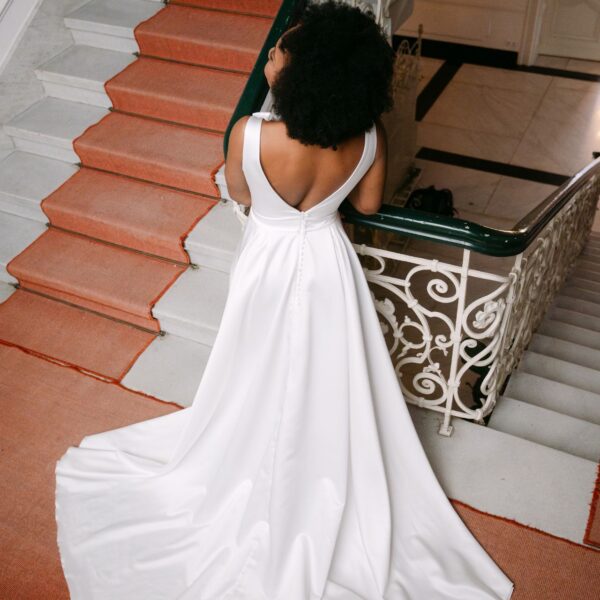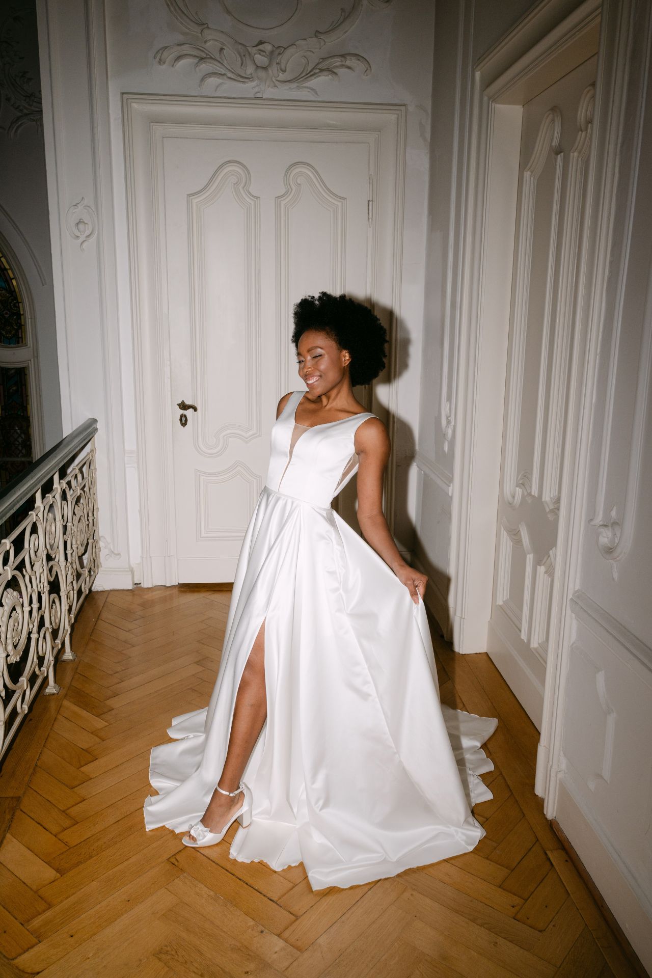 Brautkleid Kathrin ist eine Alternative aus Satin zu Simona. Der tiefe V-Ausschnitt zaubert ein sexy Dekolleté, die Cut Outs und der Schlitz im Rock runden die Kombination aus schlicht und aufregend ab. Natürlich hat auch Kathrin wieder praktische Taschen im Rock.