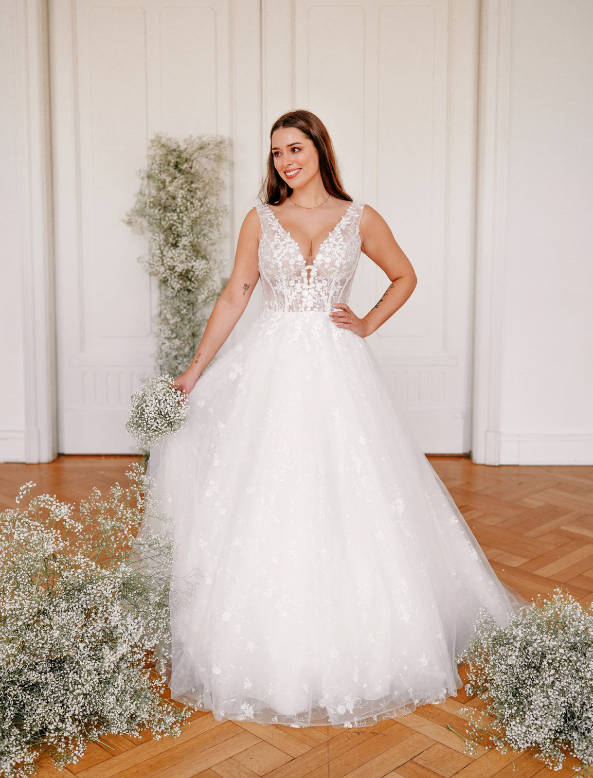 Die funkelnde Wildblumenspitze von Laurie ist etwas ganz Besonderes. Sie bringt den ivory farbenen Tüllrock zum Strahlen und verwandelt das ganze Kleid in einen zarten Prinzessinentraum. Der halbtiefe V-Ausschnitt zaubert ein wunderschönes Dekolleté.