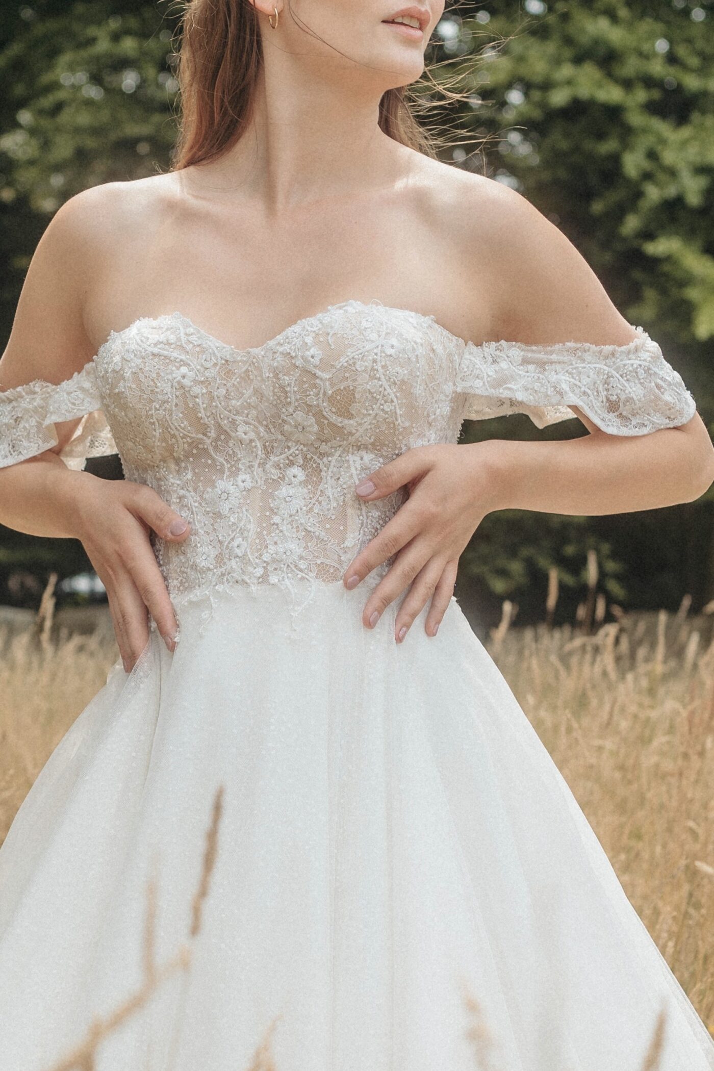 Dieses romantische Brautkleid-Design ‘Lena’ verzaubert durch die kleinen, verspielten Ärmelchen und die eng anliegende, trägerlose Corsage. Die florale, romantische Spitze verläuft fließend vom Oberteil bis in den Rock mit funkelnden Pünktchen und lässt Lena leicht und sommerlich wirken.