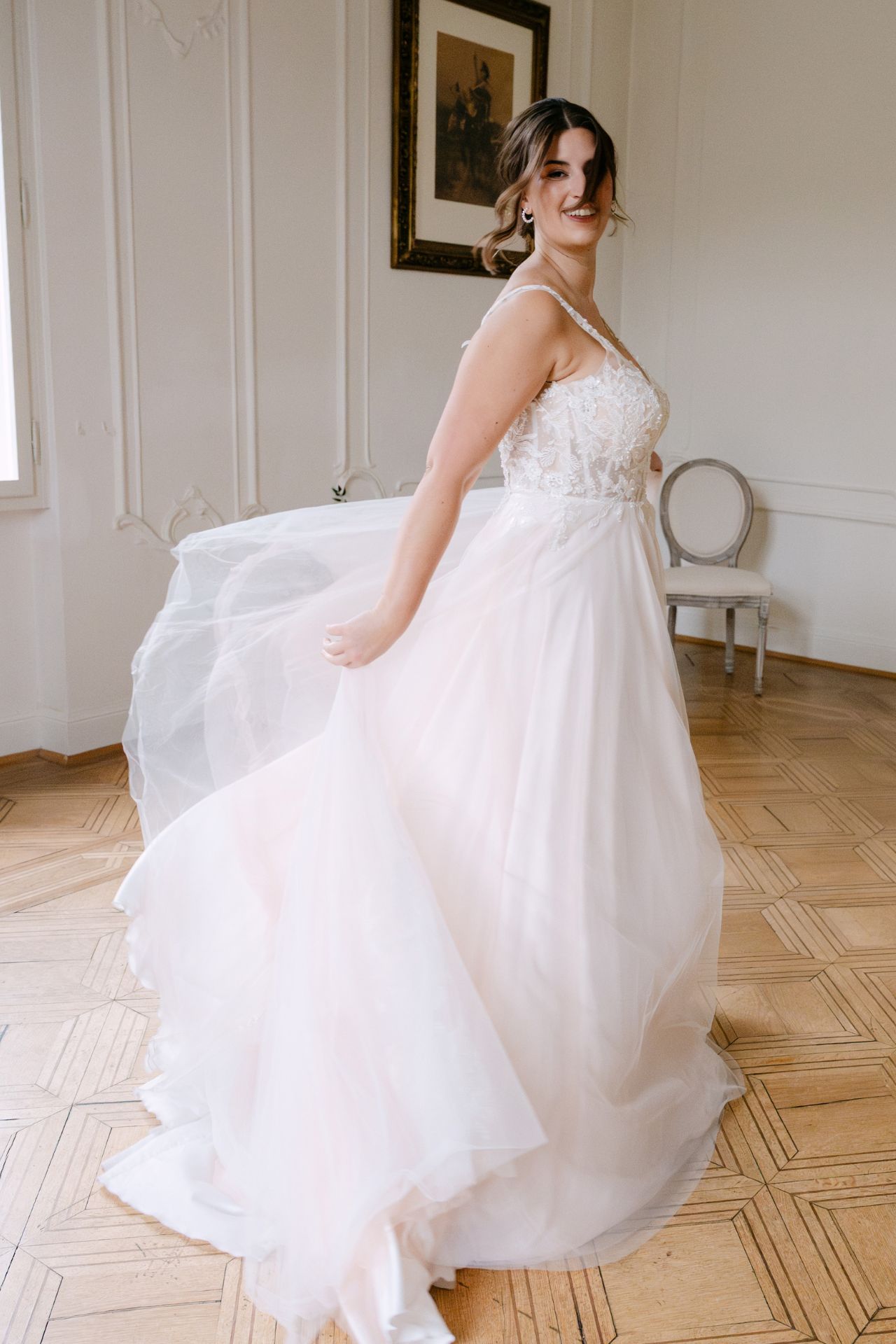 Das romantische Brautkleid ‘Maja’ bietet durch breitere Träger und eine transparente Corsage auch bei einer größeren Oberweite guten Halt und wirkt trotzdem zart und leicht. Die perlenbesetzte Spitze umspielt den V-Auschnitt, sowie den tiefen Rücken und fließt leicht auf den federleichten Rock aus ivory und blush farbenen Tüll.