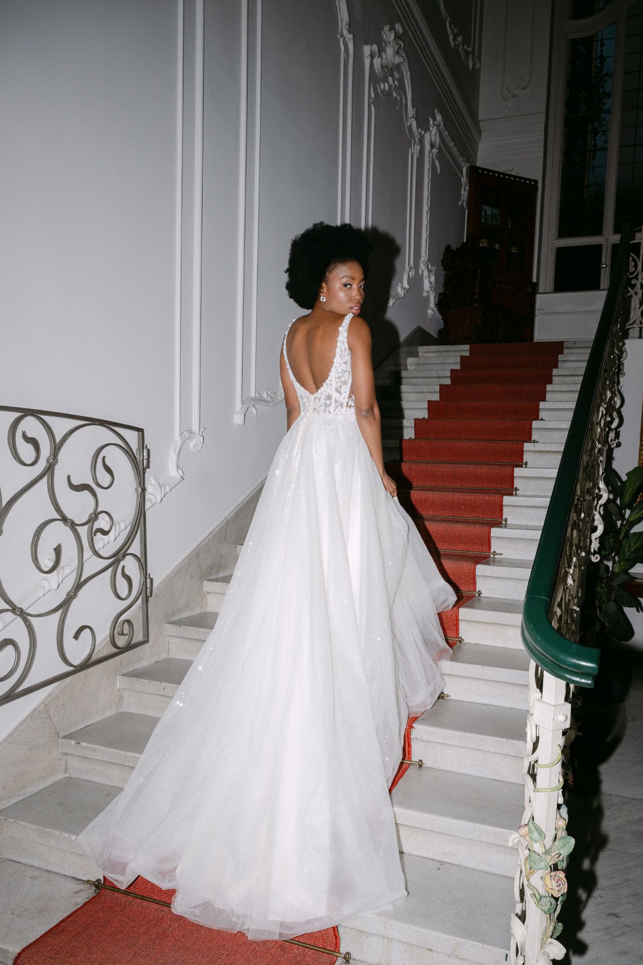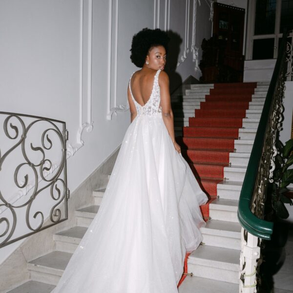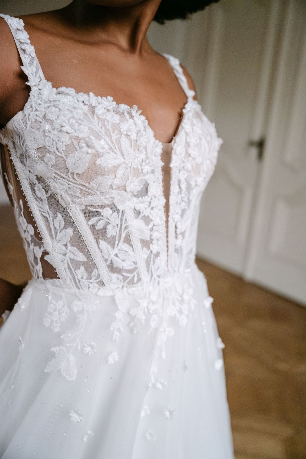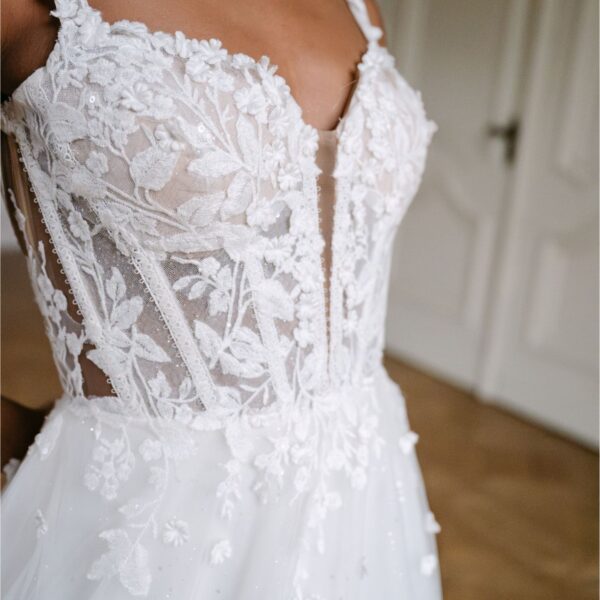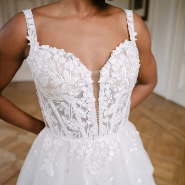 Dieses verspielte, romantische Kleid zeichnet sich durch zarte 3D-Blumen aus, die bis in den Rock reichen. Die Spaghettiträger gehen in einen tiefen Ausschnitt und Rücken über. Die sichtbaren Stäbchen verleihen dem Kleid einen Korsett-Look. Der Tüllrock in einem zarten Elfenbeinton ist mit schimmerndem Glitzertüll versehen, der ein bezauberndes Gesamtbild ergibt.