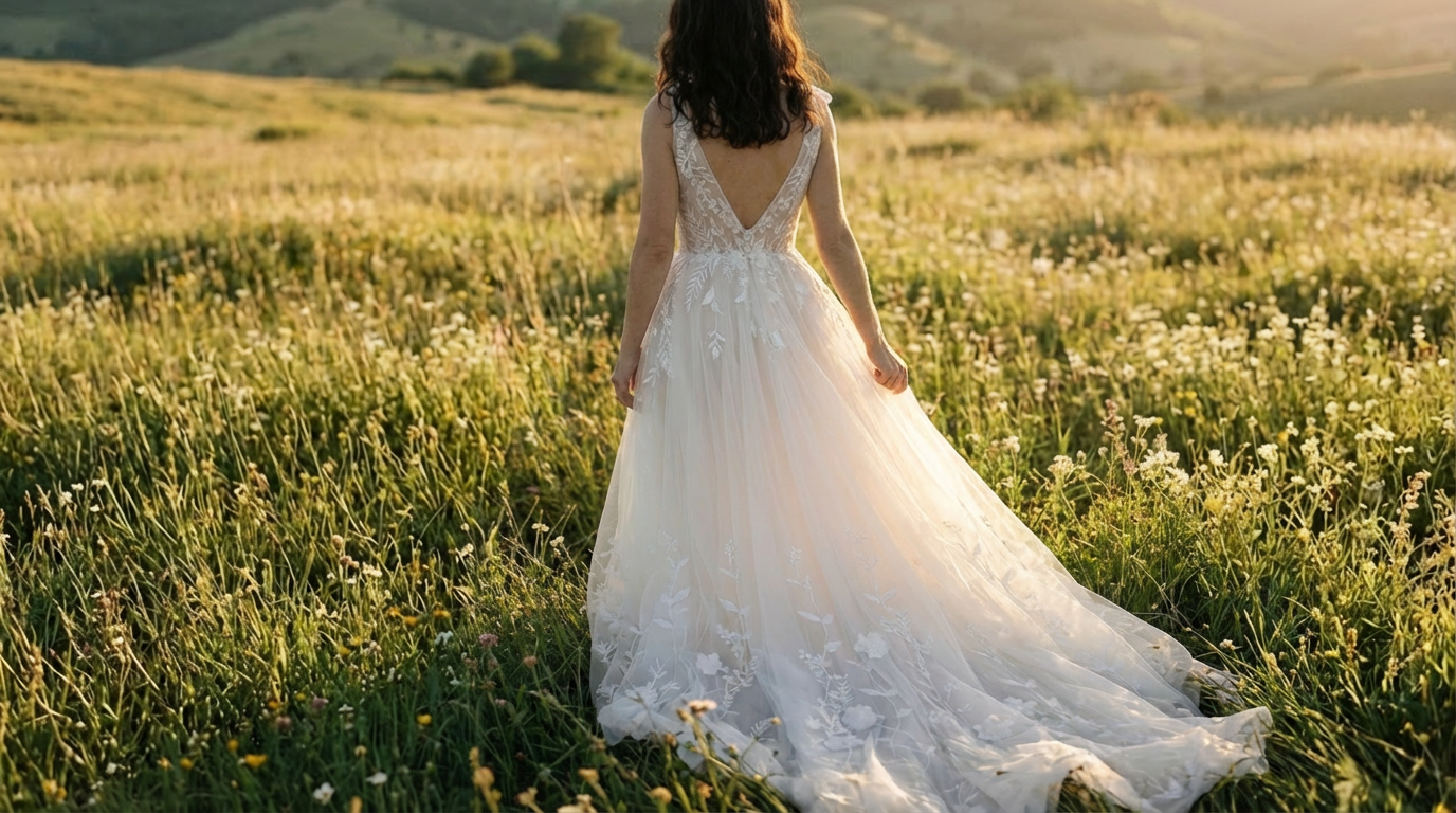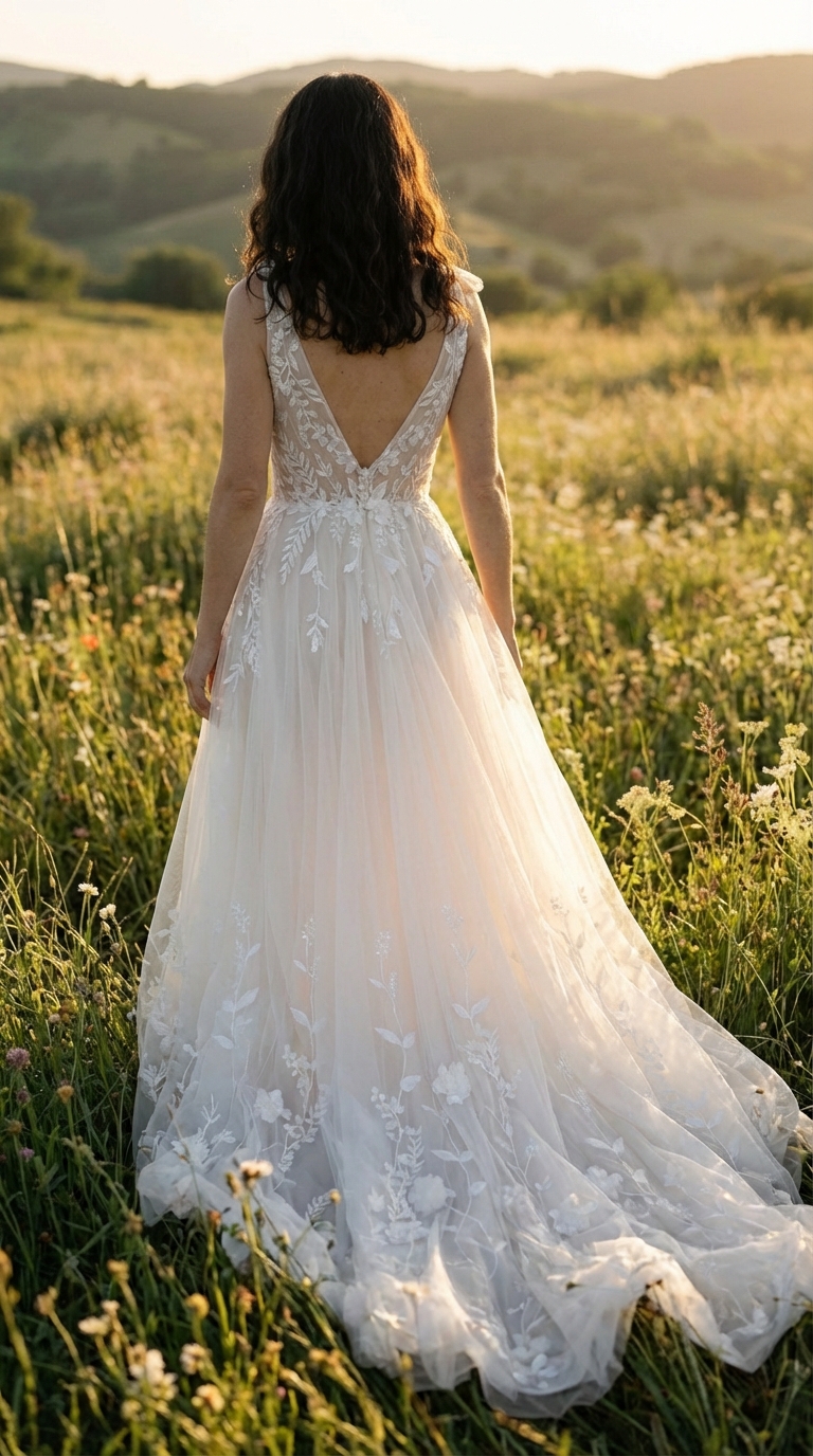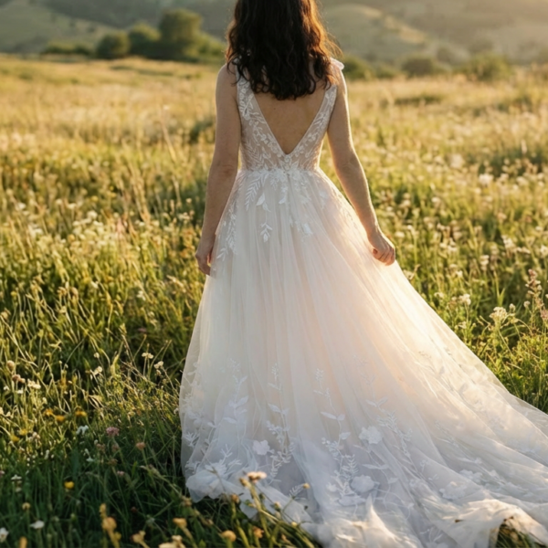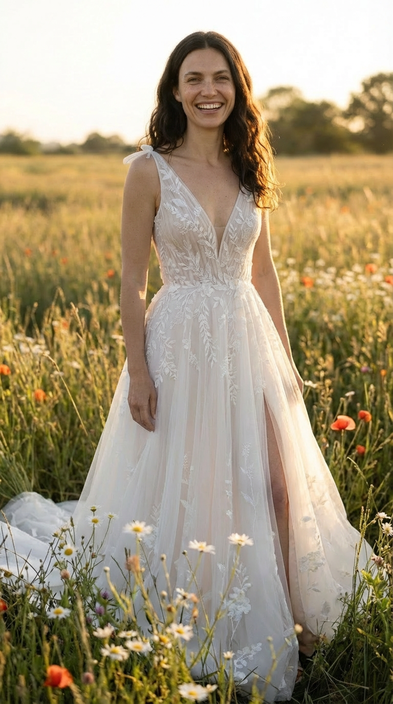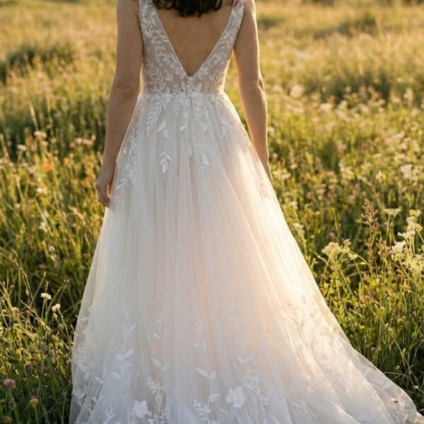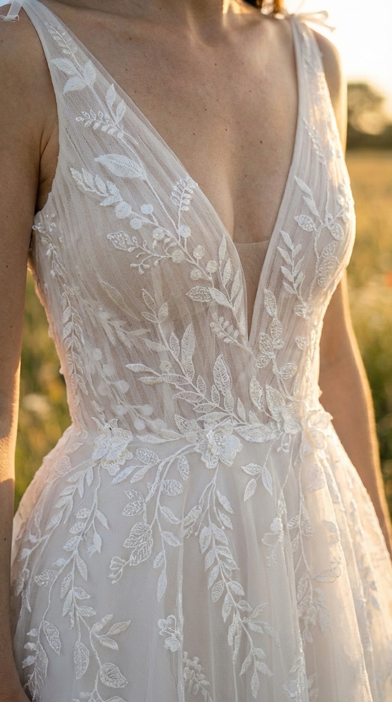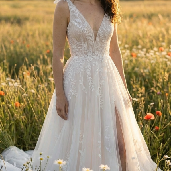 Brautkleid Riley verzaubert als fließende A-Linie aus zartem Tüll. Feine Wiesenblumen-Spitze rankt sich vom drapierten Oberteil über die Träger bis in den Rock und findet sich am Saum wieder. Kleine, abnehmbare Schleifen unterstreichen die verspielte Note. Der integrierte Beinschlitz sorgt für eine moderne, feminine Leichtigkeit.