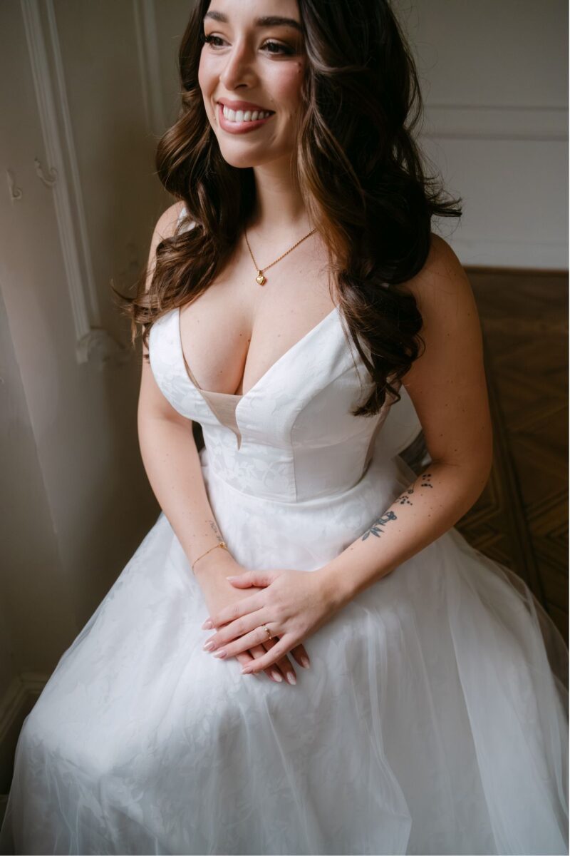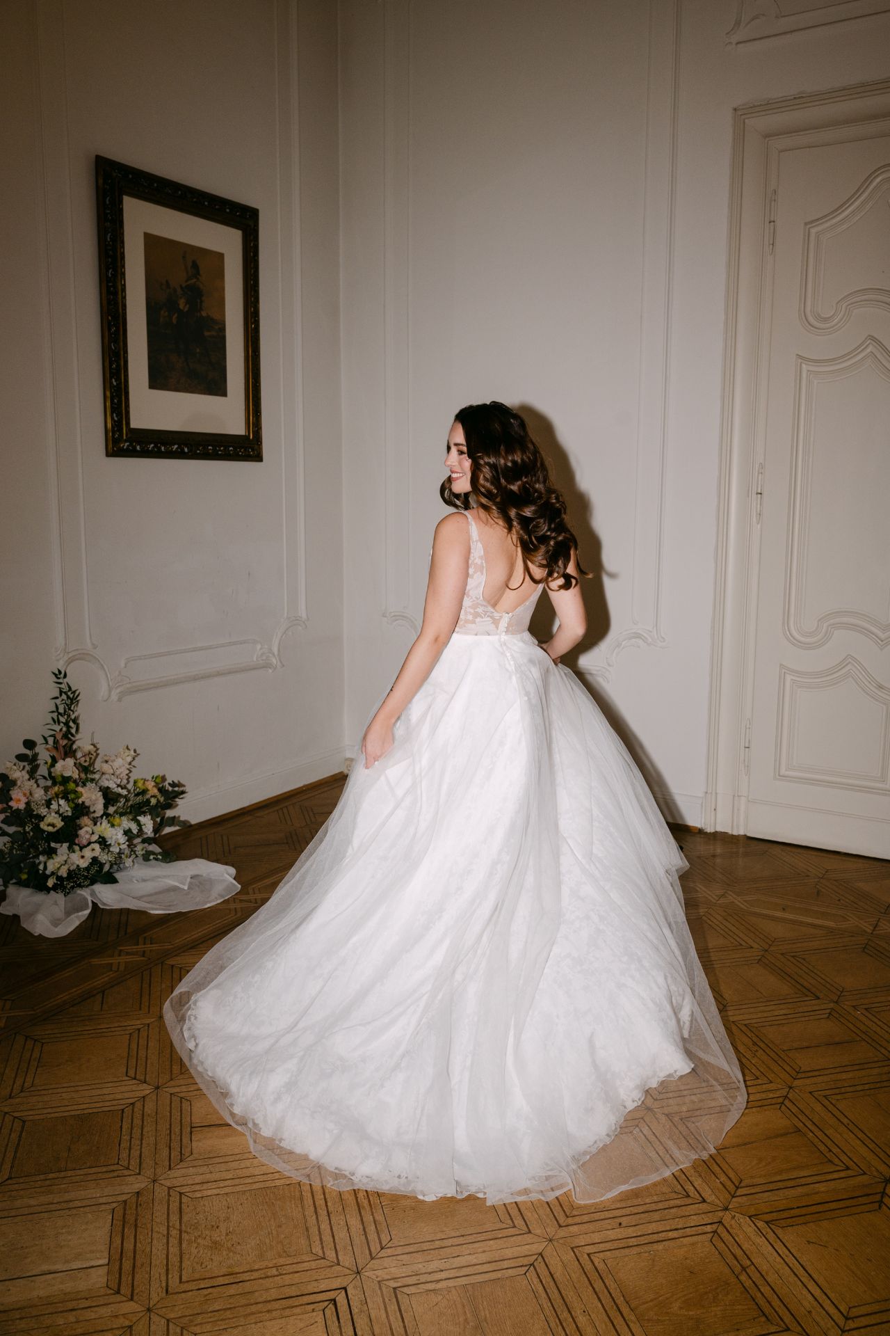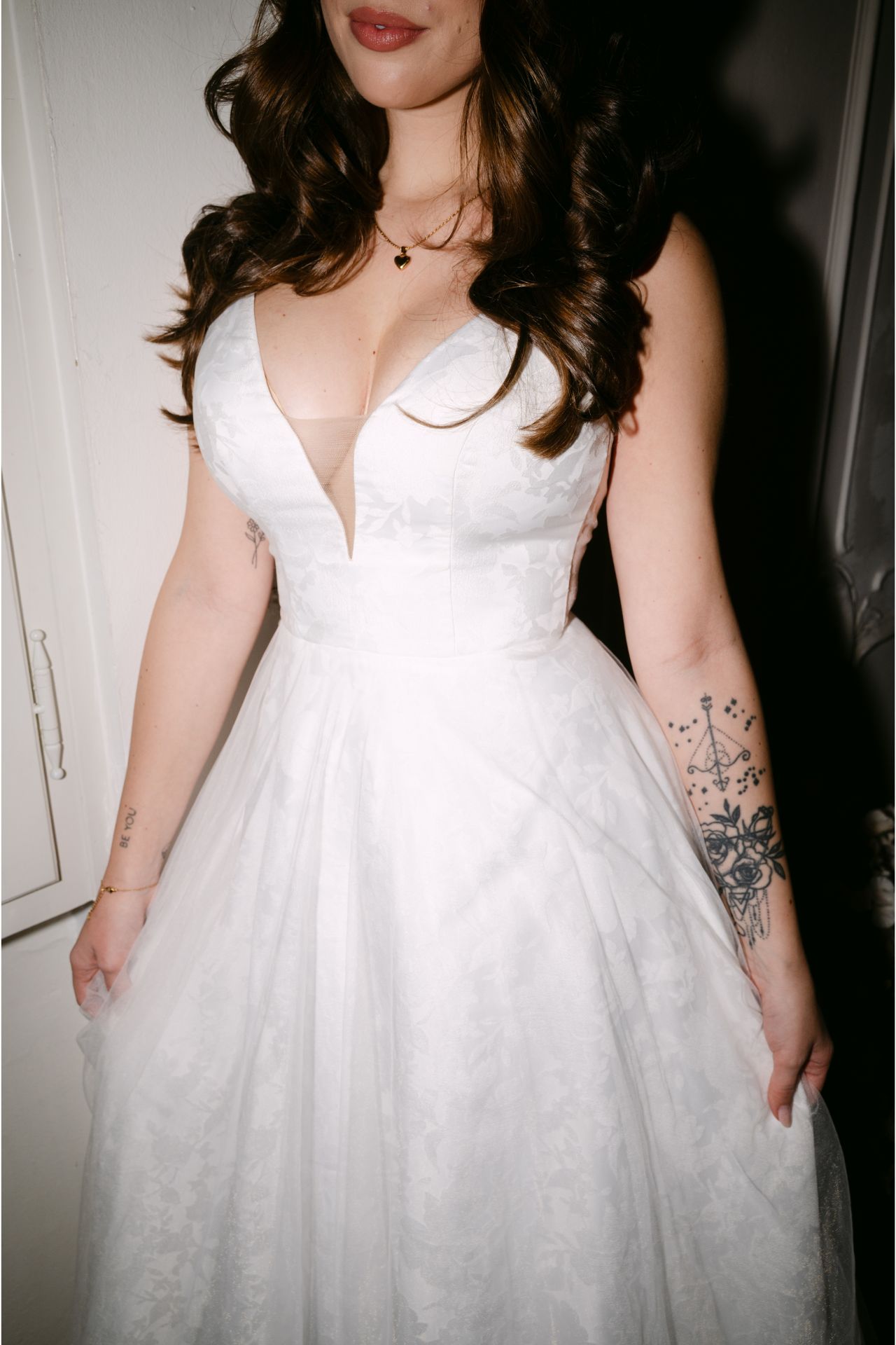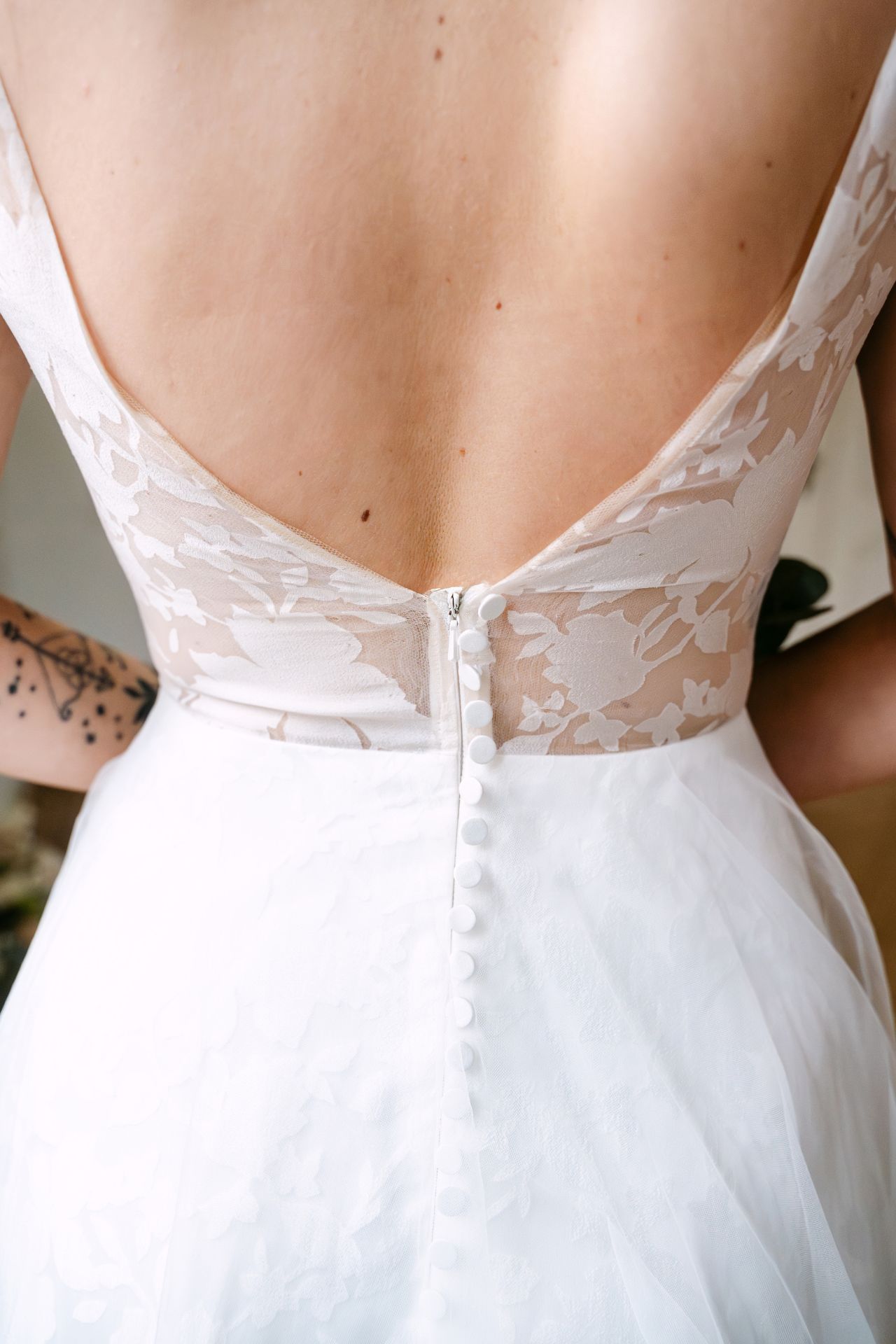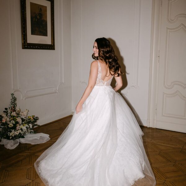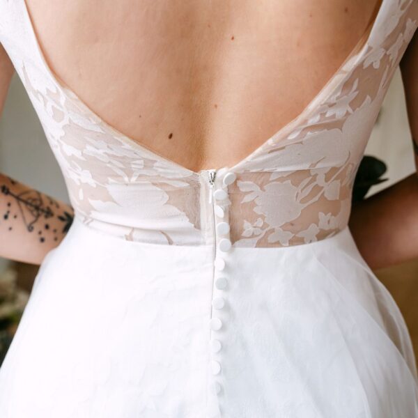 Brautkleid ‘Stella’ ist ein klassisches Brautkleid in A-Linie und wird vor allem durch den transparenten Blumenorganza zu einem eleganten Hingucker. Der hauchzarte Stoff in Blumenoptik kommt vor allem im transparenten Rücken und dem leichten Tüllrock zur Geltung.