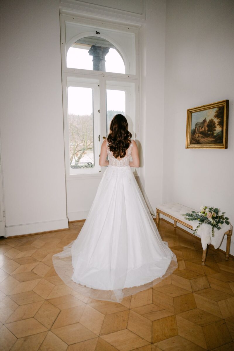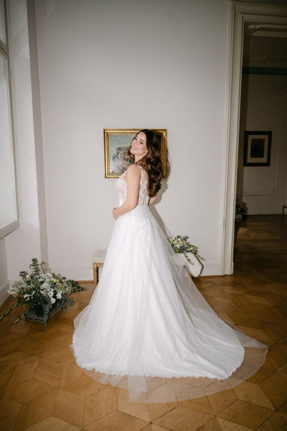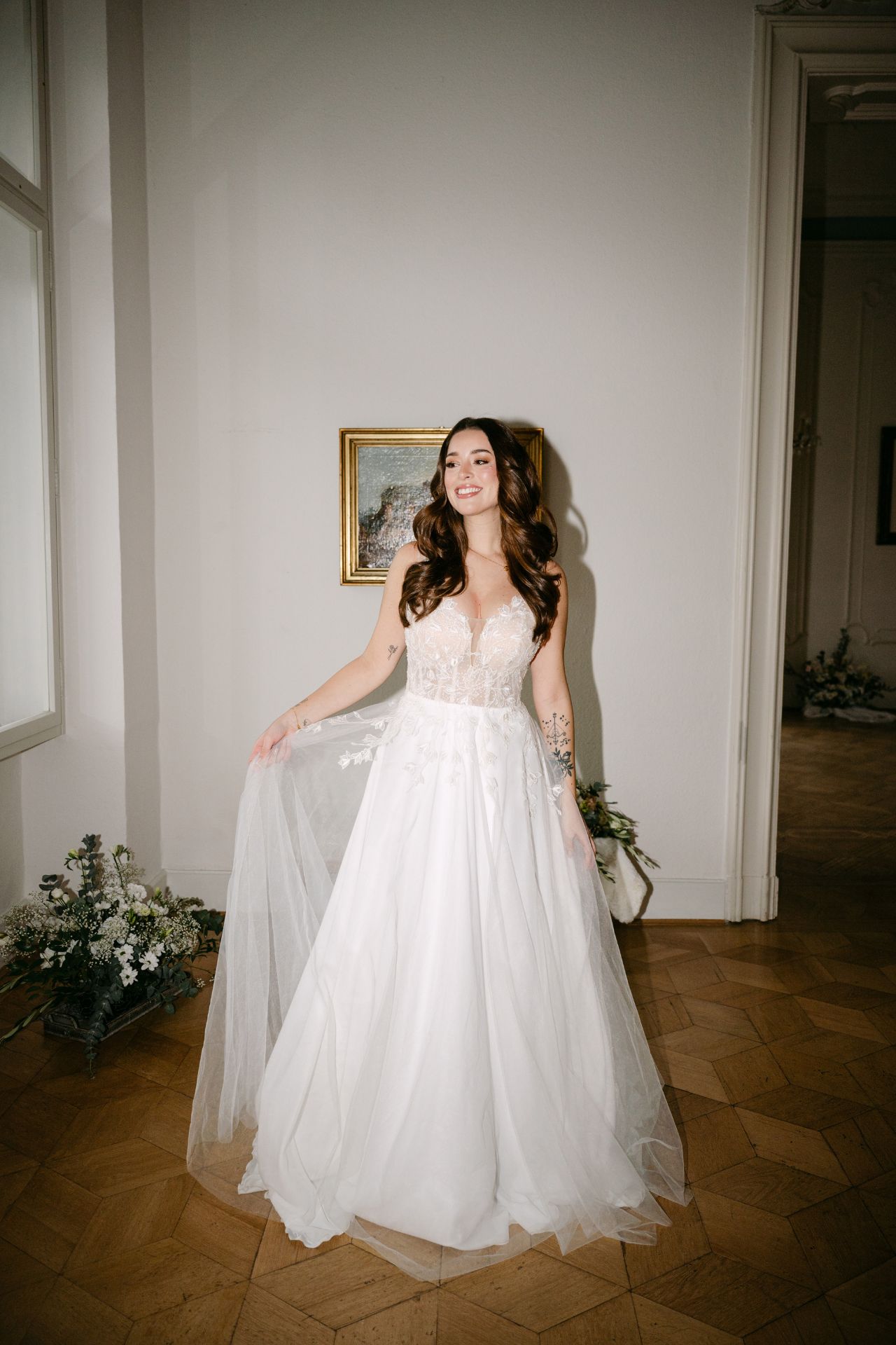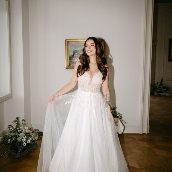Das Brautkleid Stina bietet mit seinen breiteren Trägern Halt, ist aber gleichzeitig durch die Transparenz im Oberteil zart und verspielt. Feine Pailletten lassen die Tulpenspitz funkeln und der halbtiefe Ausschnitt sorgt für einen besonderen Hingucker. Die Spitze läuft auf den leicht fallenden Rock aus Chiffon und Tüll.