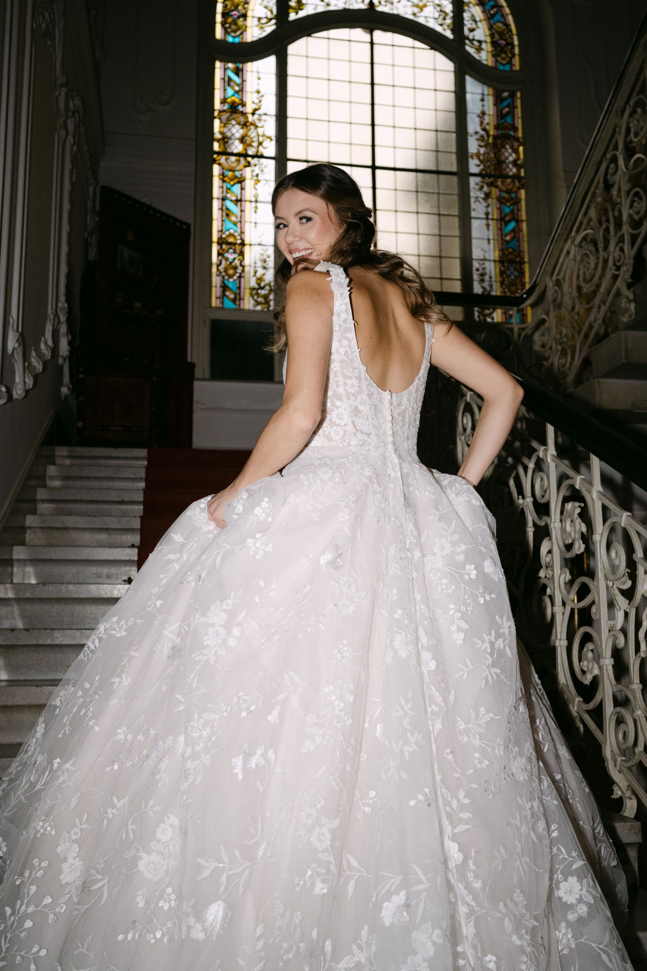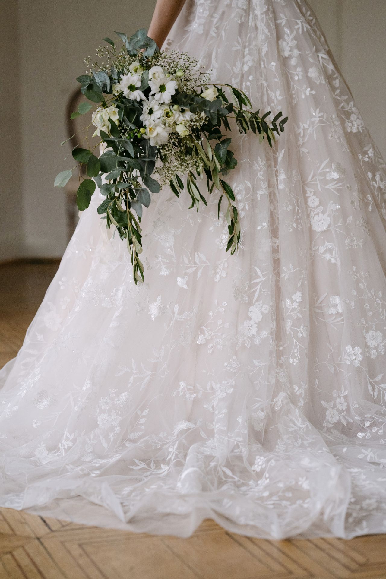 Das Design Vicky ist ein wahr gewordener Traum aus Spitze. Die romantischen Wiesenblumen erstrecken sich über das transparente Oberteil bis in den Rock. Besonders hervorgehoben wird die funkelnde Spitze durch den Unterstoff in der Farbe Sand. Die abnehmbaren Ärmel aus Tüll und Spitze runden den romantischen Look wunderbar ab.