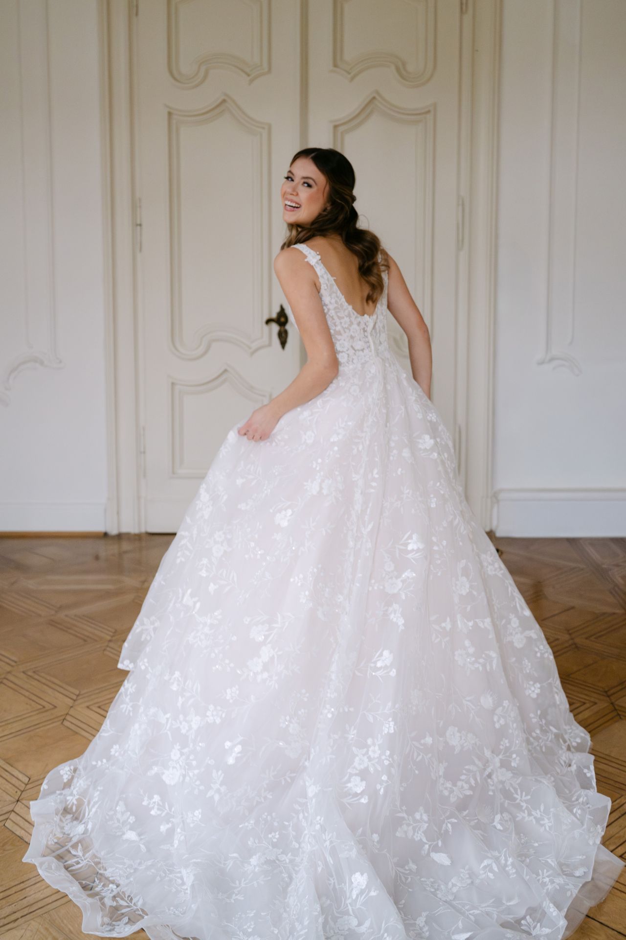Dieses Kleid lässt sich teilweise mitgestalten. Beliebte Individualisierungen unserer Bräute sind z. B. Ärmelvariationen oder Farbwechsel. Je nach Verfügbarkeit auch vergünstigt zur Direktmitnahme möglich.