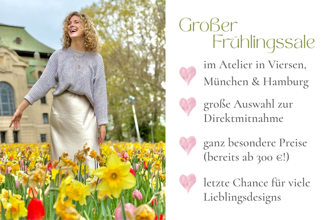 Alles, was du dafür tun musst, ist dir einen Frühlingssale Termin (1-stündiger Termin) für den 17. + 18.04 oder 24. + 25.04. in Hamburg, München oder Viersen (bei Düsseldorf) zu buchen und dich in eines unserer traumhaften Designs zu verlieben! 🥰